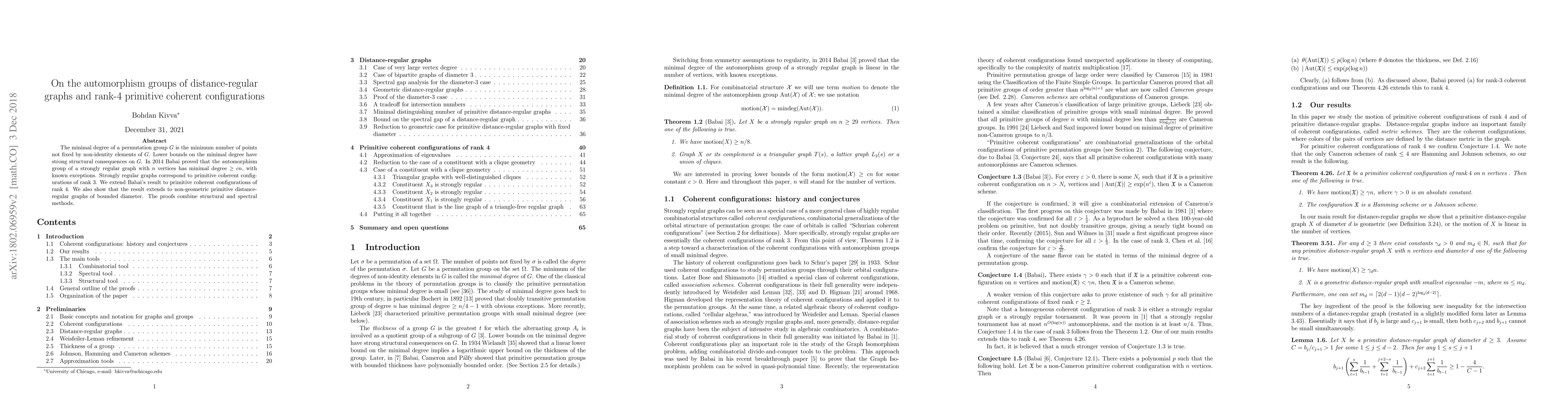The minimal degree of a permutation group $G$ is the minimum number of points not fixed by non-identity elements of $G$. Lower bounds on the minimal degree have strong structural consequences on $G$. In 2014 Babai proved that the automorphism group of a strongly regular graph with $n$ vertices has minimal degree $\geq c n$, with known exceptions. Strongly regular graphs correspond to primitive coherent configurations of rank 3. We extend Babai's result to primitive coherent configurations of rank 4. We also show that the result extends to non-geometric distance-regular graphs of bounded diameter. The proofs combine structural and spectral methods.