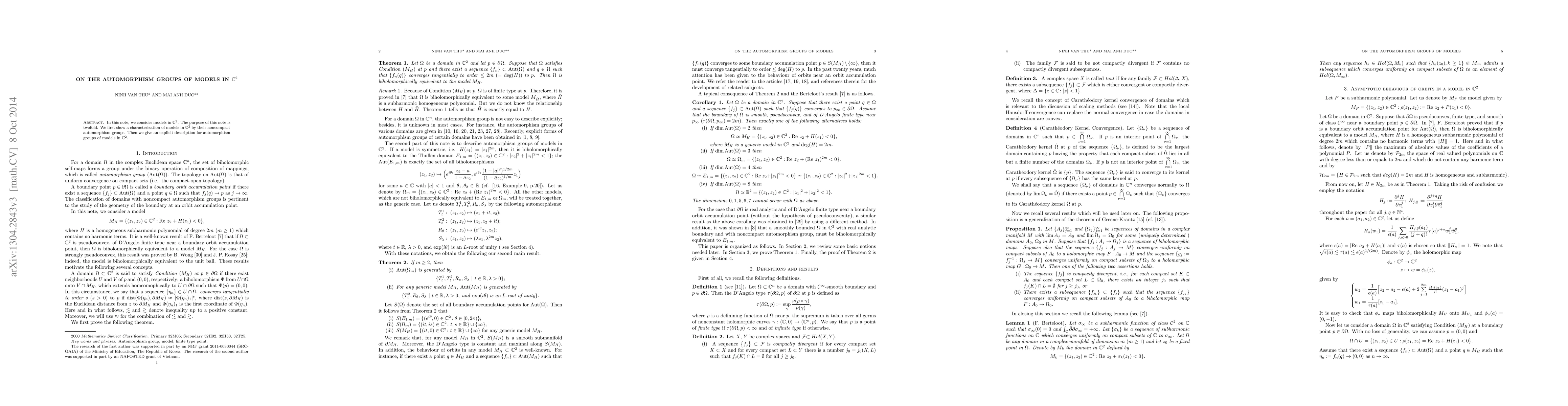 In this note, we consider models in $\mathbb C^2$. The purpose of this note is twofold. We first show a characterization of models in $\mathbb C^2$ by their noncompact automorphism groups. Then we give an explicit description for automorphism groups of models in $\mathbb C^2$.