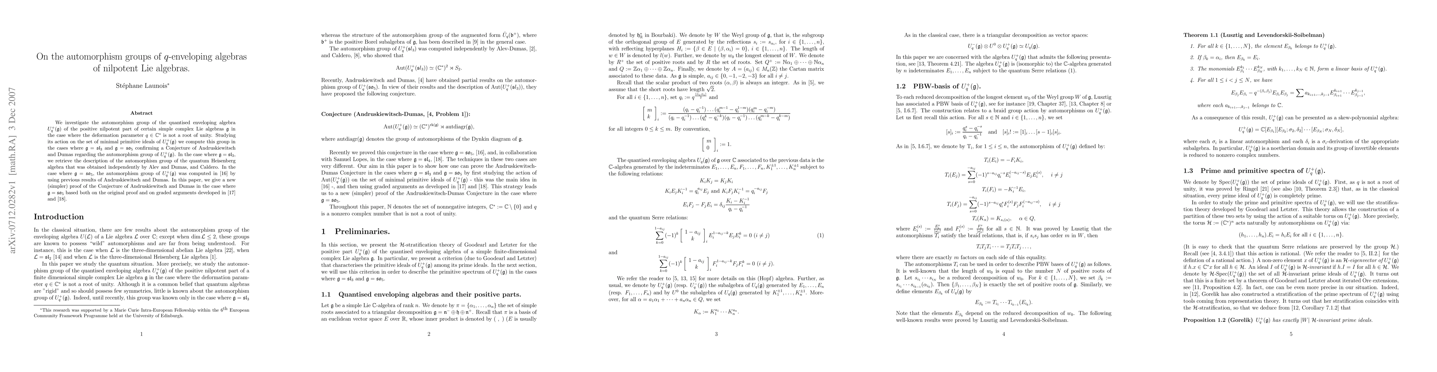 Researchers investigate the automorphism group of q-enveloping algebras of nilpotent Lie algebras for certain simple complex Lie algebras, confirming a conjecture in two cases and providing a simpler proof in one.