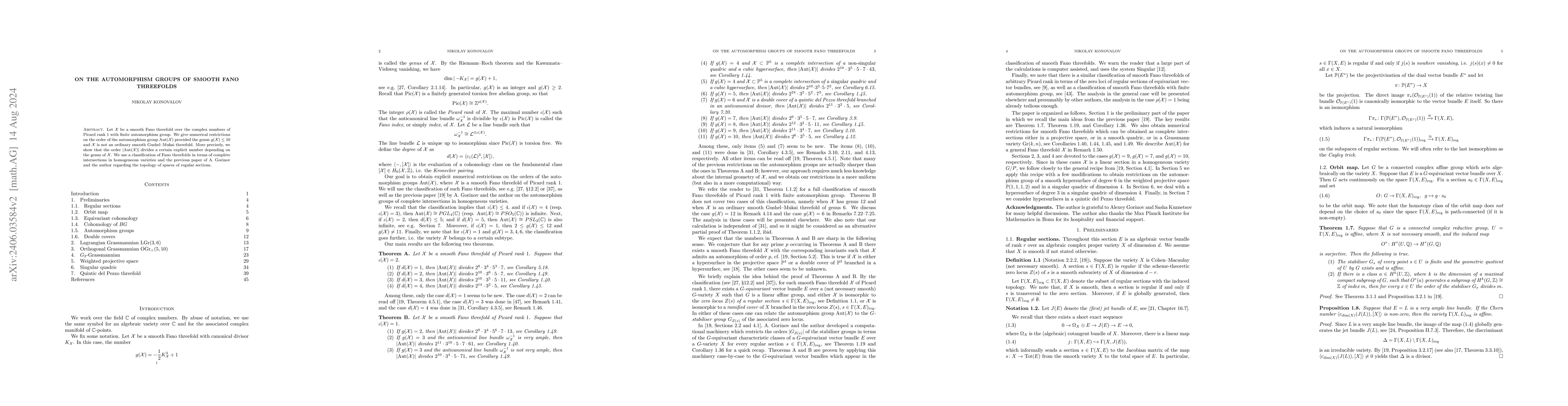 Let $\mathcal{X}$ be a smooth Fano threefold over the complex numbers of Picard rank $1$ with finite automorphism group. We give numerical restrictions on the order of the automorphism group $\mathrm{Aut}(\mathcal{X})$ provided the genus $g(\mathcal{X})\leq 10$ and $\mathcal{X}$ is not an ordinary smooth Gushel-Mukai threefold. More precisely, we show that the order $|\mathrm{Aut}(\mathcal{X})|$ divides a certain explicit number depending on the genus of $\mathcal{X}$. We use a classification of Fano threefolds in terms of complete intersections in homogeneous varieties and the previous paper of A. Gorinov and the author regarding the topology of spaces of regular sections.