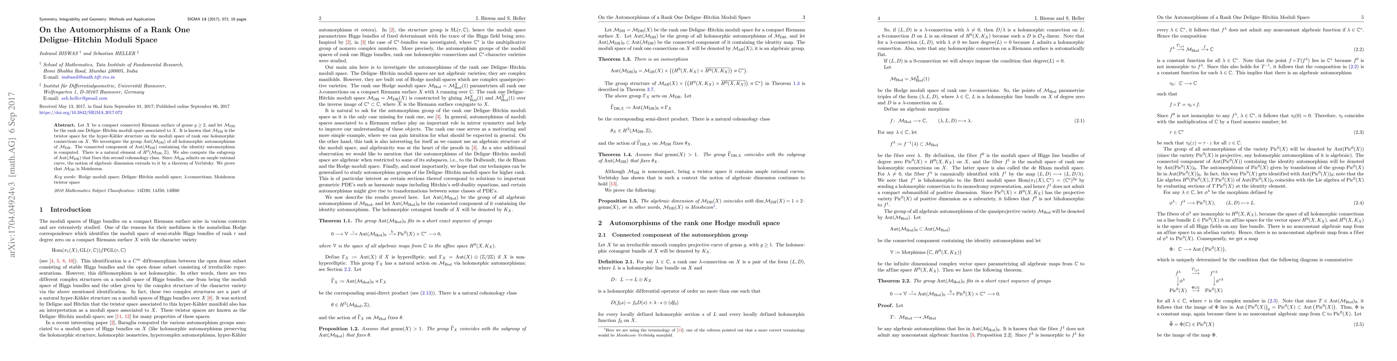 Researchers investigated the automorphisms of a rank one Deligne-Hitchin moduli space, finding that it is Moishezon with a specific subgroup of automorphisms fixing its second cohomology class.