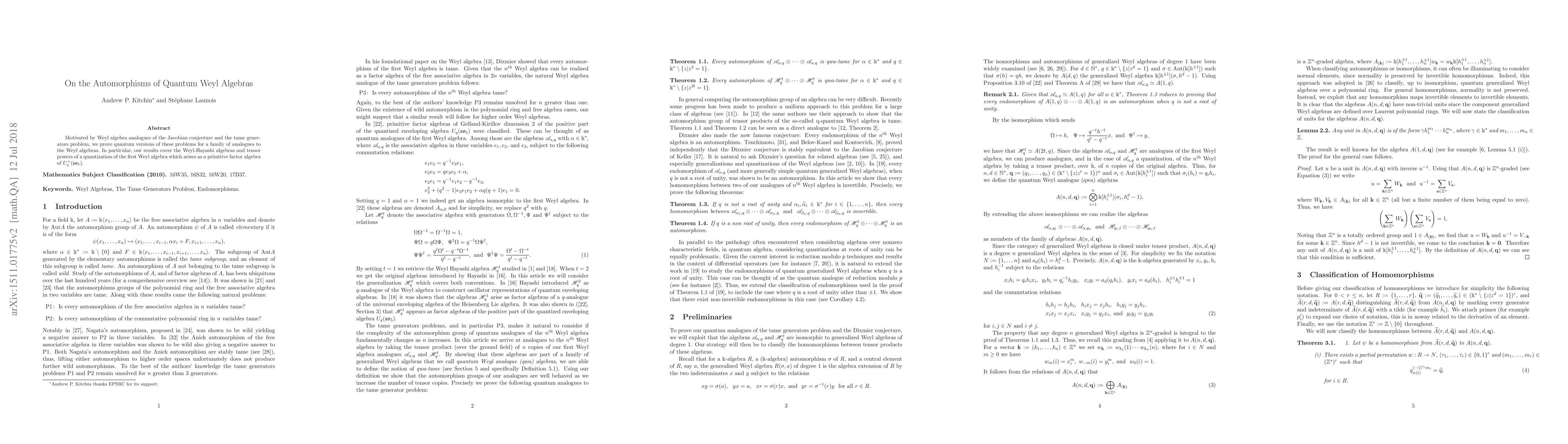 Motivated by Weyl algebra analogues of the Jacobian conjecture and the Tame Generators problem, we prove quantum versions of these problems for a family of analogues to the Weyl algebras. In particular, our results cover the Weyl-Hayashi algebras and tensor powers of a quantization of the first Weyl algebra which arises as a primitive factor algebra of $U_q^+(\mathfrak{so}_5)$.