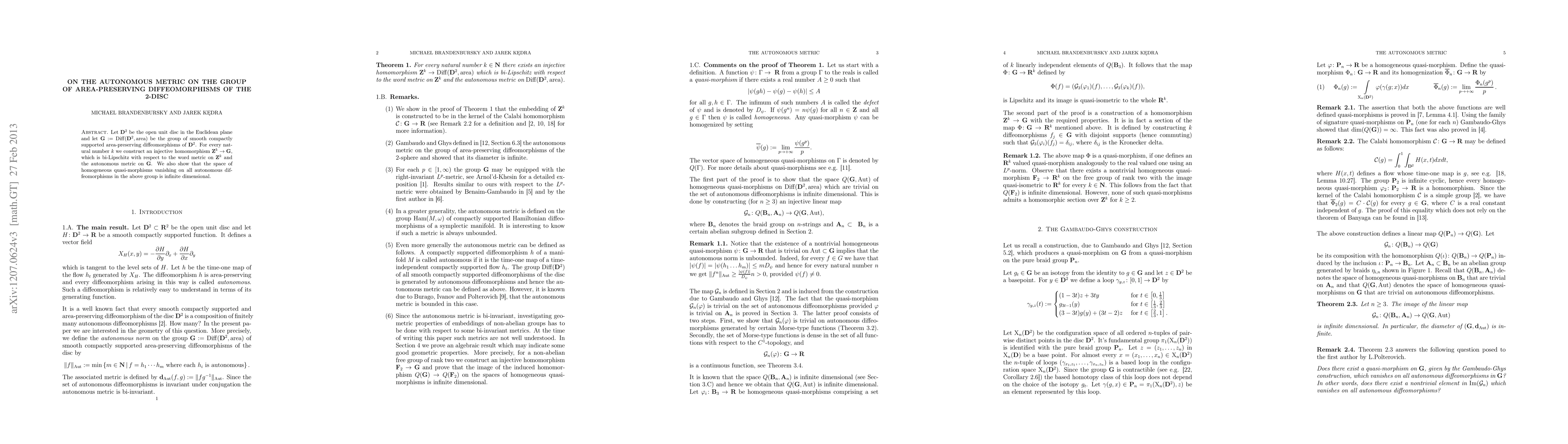 This paper explores the autonomous metric on the group of area-preserving diffeomorphisms of the 2-disc, constructing a bi-Lipschitz homomorphism from a finitely generated free abelian group to this group, and demonstrating that the space of homogeneous quasi-morphisms vanishing on these diffeomorphisms is infinite dimensional.