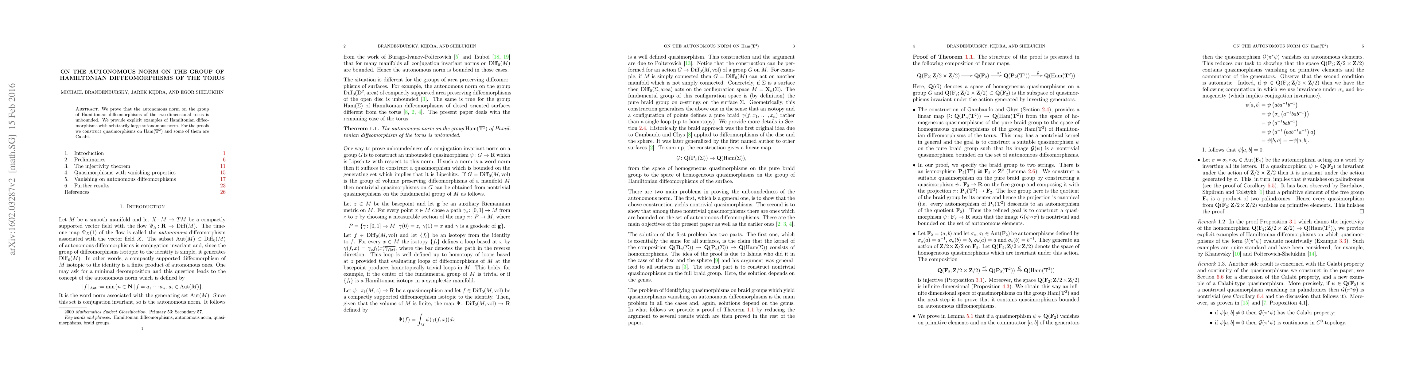 Summary: The paper demonstrates that the autonomous norm on the group of Hamiltonian diffeomorphisms of the torus is unbounded, providing examples of such diffeomorphisms with large norms. The proofs utilize the construction of quasimorphisms, including some Calabi quasimorphisms, on the group.