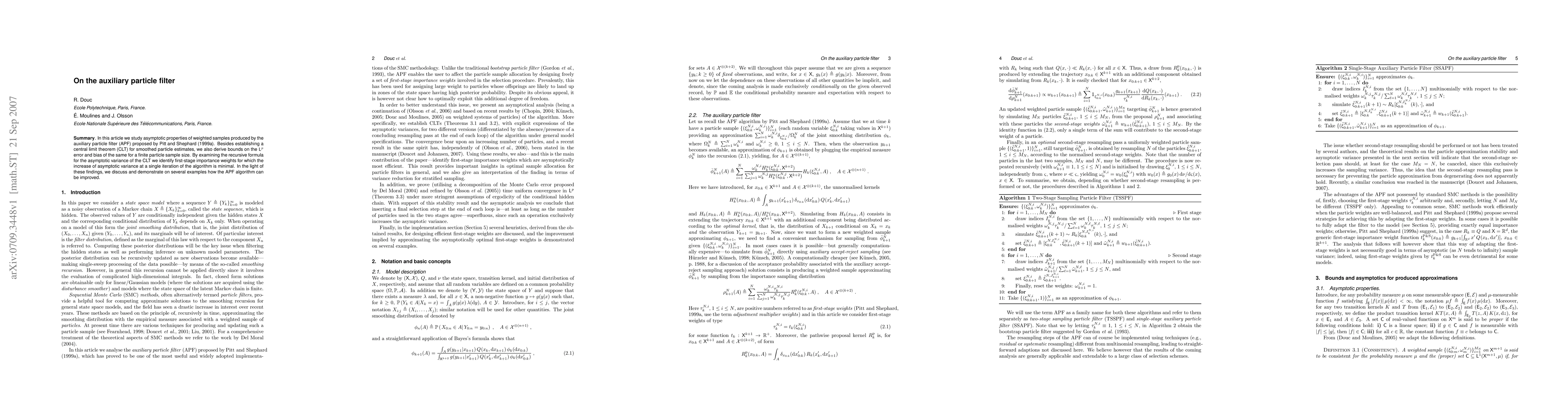In this article we study asymptotic properties of weighted samples produced by the auxiliary particle filter (APF) proposed by pitt and shephard (1999). Besides establishing a central limit theorem (CLT) for smoothed particle estimates, we also derive bounds on the Lp error and bias of the same for a finite particle sample size. By examining the recursive formula for the asymptotic variance of the CLT we identify first-stage importance weights for which the increase of asymptotic variance at a single iteration of the algorithm is minimal. In the light of these findings, we discuss and demonstrate on several examples how the APF algorithm can be improved.