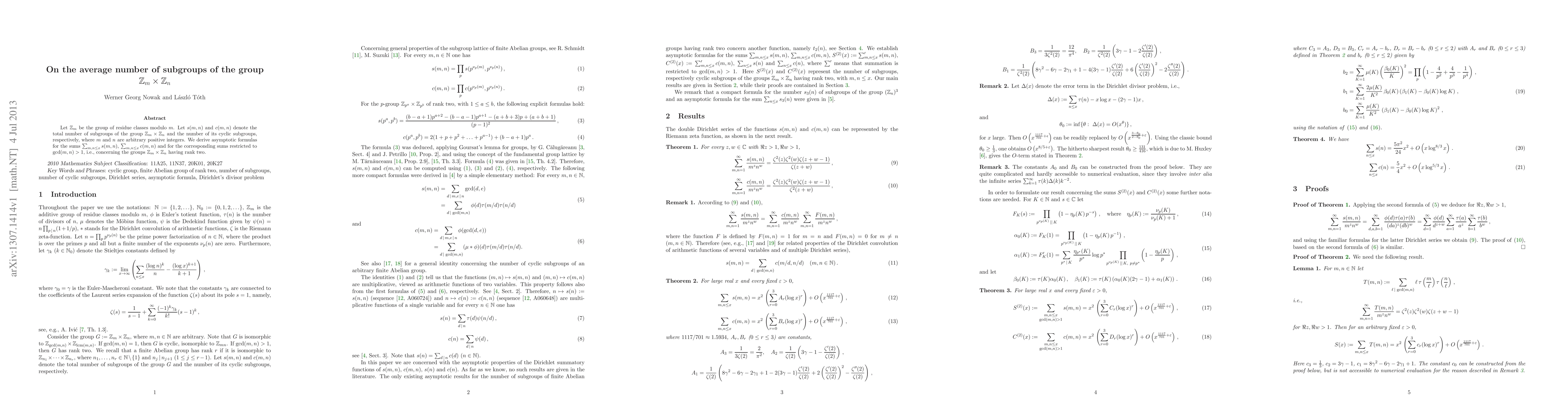 Let $\Z_m$ be the group of residue classes modulo $m$. Let $s(m,n)$ and $c(m,n)$ denote the total number of subgroups of the group $\Z_m \times \Z_n$ and the number of its cyclic subgroups, respectively, where $m$ and $n$ are arbitrary positive integers. We derive asymptotic formulas for the sums $\sum_{m,n\le x} s(m,n)$, $\sum_{m,n\le x} c(m,n)$ and for the corresponding sums restricted to $\gcd(m,n)>1$, i.e., concerning the groups $\Z_m \times \Z_n$ having rank two.
