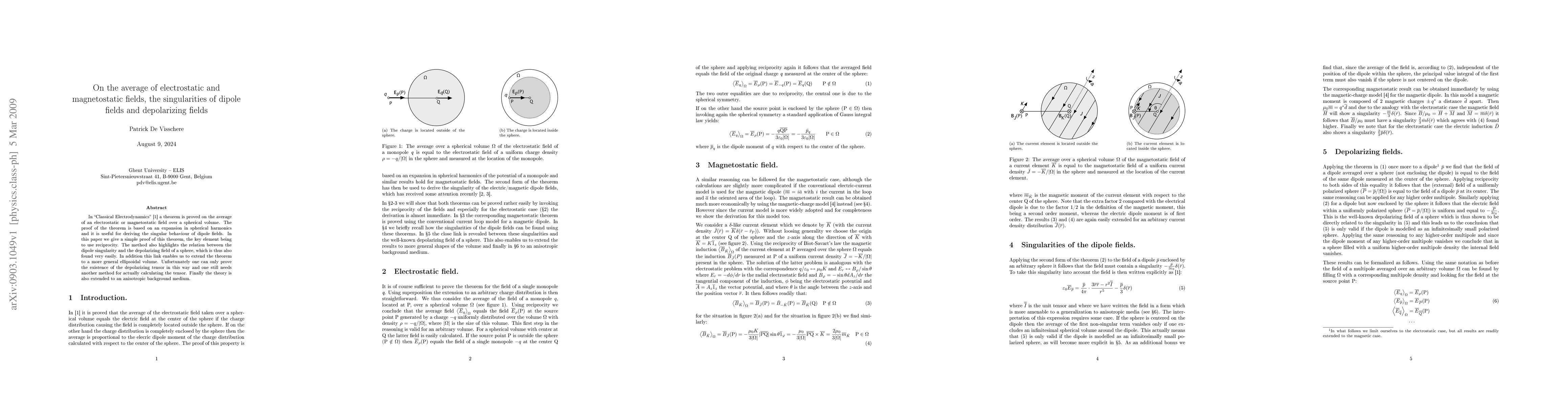 In "Classical Electrodynamics" (Jackson) a theorem is proved on the average of an electrostatic or magnetostatic field over a spherical volume. The proof of the theorem is based on an expansion in spherical harmonics and it is useful for deriving the singular behaviour of dipole fields. In this paper we give a simple proof of this theorem, the key element being to use reciprocity. The method also highlights the relation between the dipole singularity and the depolarizing field of a sphere, which is thus also found very easily. In addition this link enables us to extend the theorem to a more general ellipsoidal volume. Unfortunately one can only prove the existence of the depolarizing tensor in this way and one still needs another method for actually calculating the tensor. Finally the theory is also extended to an anisotropic background medium.