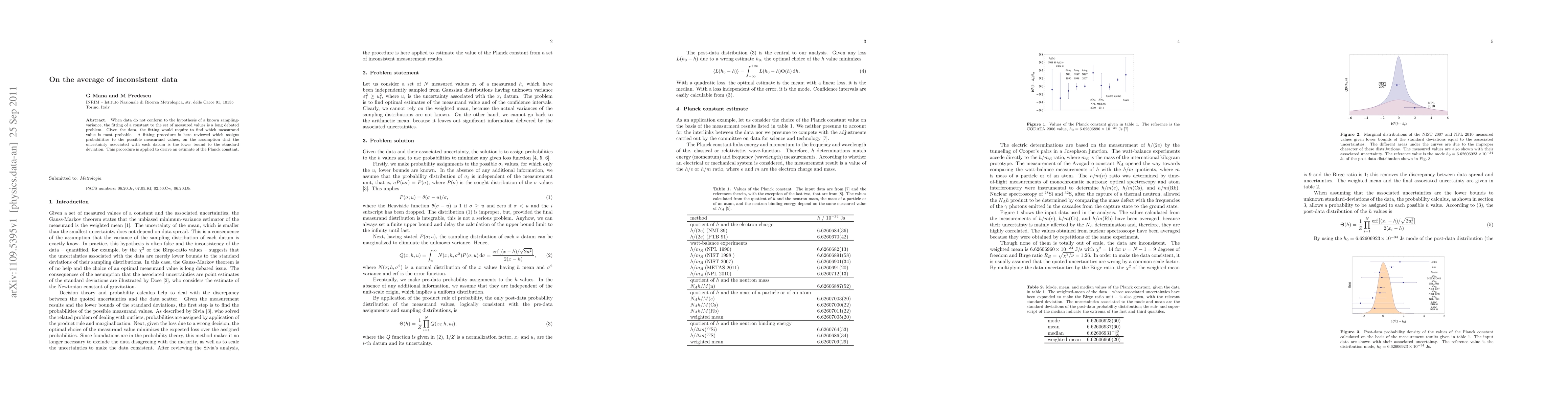 When data do not conform to the hypothesis of a known sampling-variance, the fitting of a constant to the set of measured values is a long debated problem. Given the data, the fitting would require to find which measurand value is most probable. A fitting procedure is here reviewed which assigns probabilities to the possible measurand values, on the assumption that the uncertainty associated with each datum is the lower bound to the standard deviation. This procedure is applied to derive an estimate of the Planck constant.