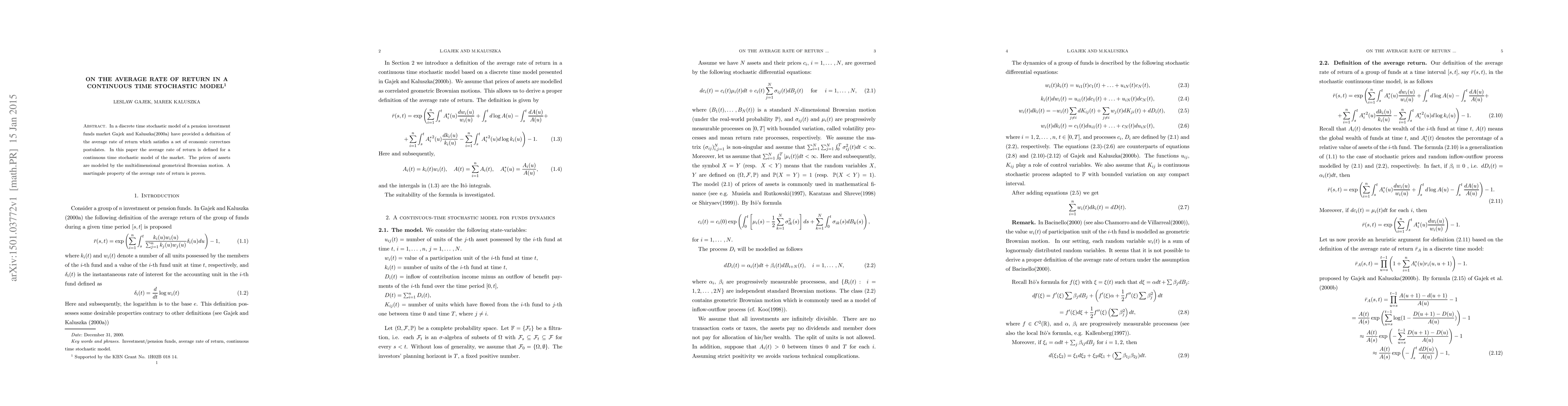 This paper extends the definition of the average rate of return from a discrete to a continuous time stochastic model for pension investment funds, employing multidimensional geometrical Brownian motion for asset prices and proving a martingale property for the average rate of return.