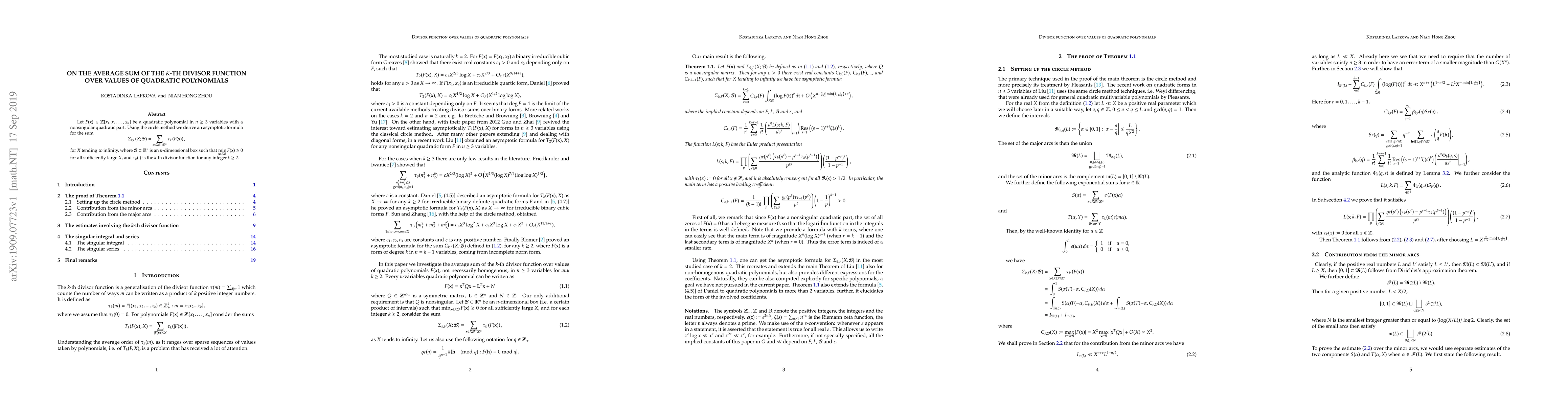 A paper derives an asymptotic formula for the average sum of a k-th divisor function over values of quadratic polynomials, using the circle method, with implications for number theory and algebraic geometry.