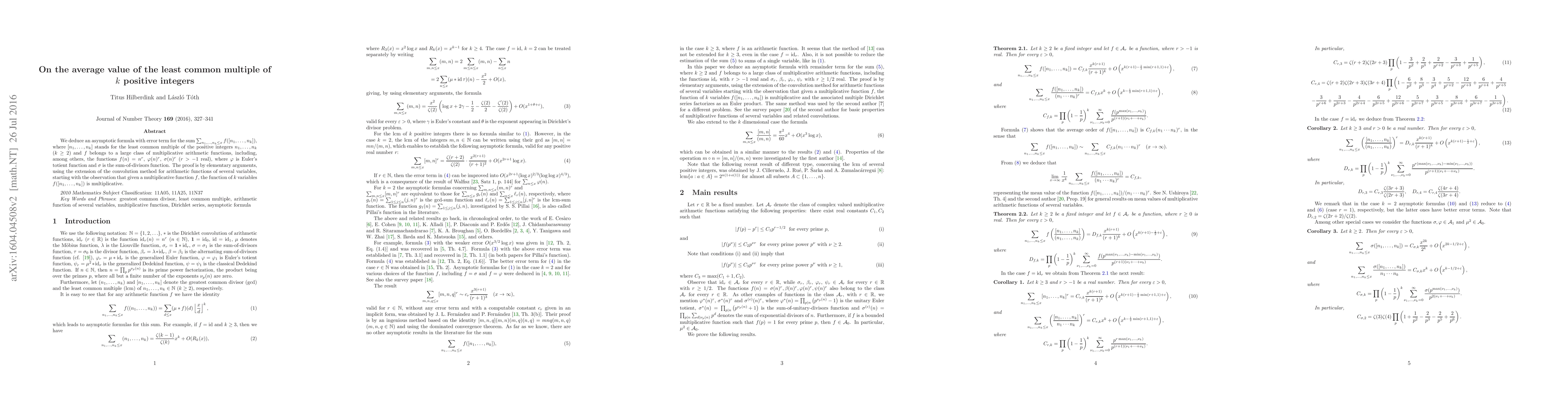 We deduce an asymptotic formula with error term for the sum $\sum_{n_1,\ldots,n_k \le x} f([n_1,\ldots, n_k])$, where $[n_1,\ldots, n_k]$ stands for the least common multiple of the positive integers $n_1,\ldots, n_k$ ($k\ge 2$) and $f$ belongs to a large class of multiplicative arithmetic functions, including, among others, the functions $f(n)=n^r$, $\varphi(n)^r$, $\sigma(n)^r$ ($r>-1$ real), where $\varphi$ is Euler's totient function and $\sigma$ is the sum-of-divisors function. The proof is by elementary arguments, using the extension of the convolution method for arithmetic functions of several variables, starting with the observation that given a multiplicative function $f$, the function of $k$ variables $f([n_1,\ldots,n_k])$ is multiplicative.