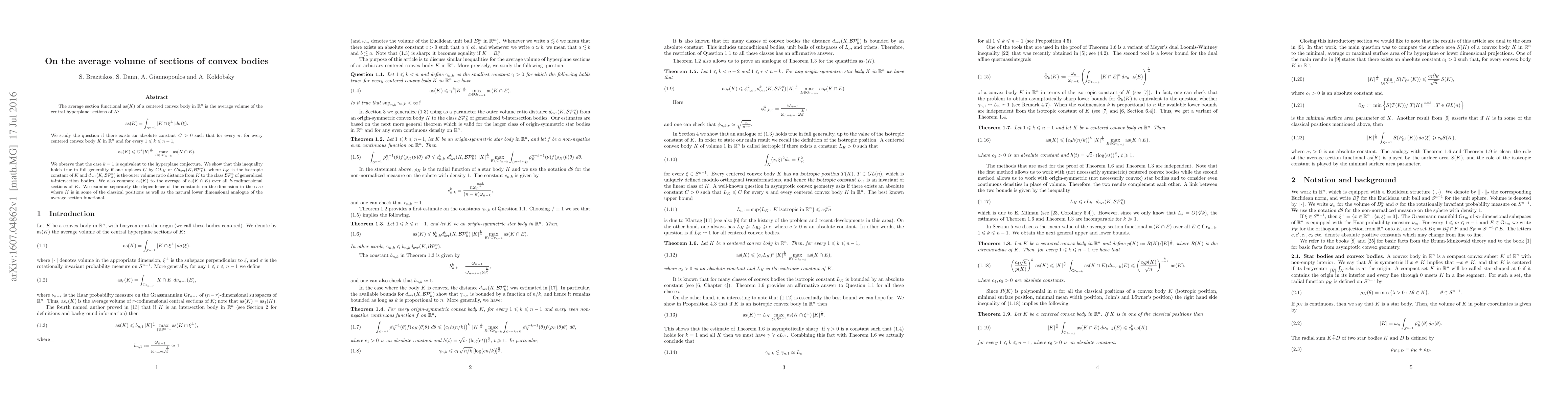 This paper explores the average volume of sections of convex bodies in ${\mathbb R}^n$, focusing on the inequality involving the average section functional ${\rm as}(K)$. It establishes that the inequality holds if $C$ is replaced by dimension-dependent constants $CL_K$ or $Cd_{\rm ovr}(K,{\cal{BP}}_k^n)$, and discusses the hyperplane conjecture in the context of $k=1$.