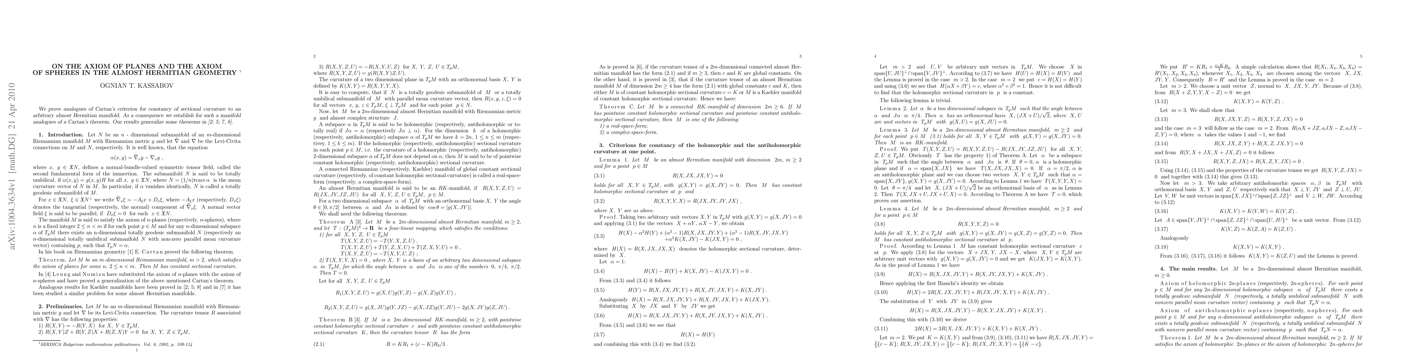 This paper proves criteria for constancy of holomorphic and antiholomorphic sectional curvatures in almost Hermitian manifolds, demonstrating that such manifolds satisfying specific axioms are either real or complex space forms.