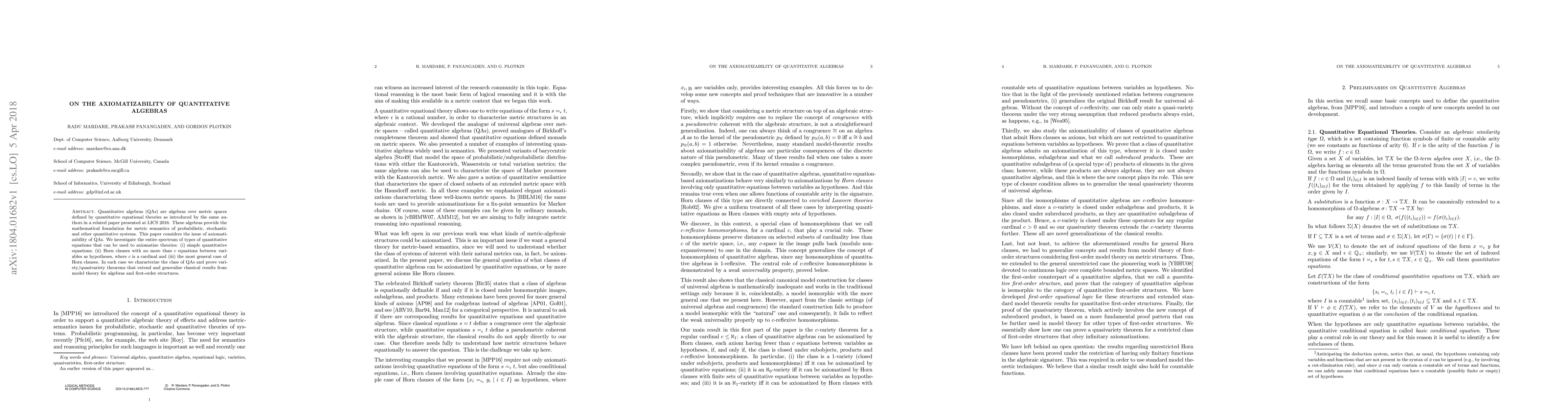 This paper explores the axiomatizability of quantitative algebras (QAs), which underpin the metric semantics of probabilistic and stochastic systems. It examines various types of quantitative equations to axiomatize QAs, proving variety/quasivariety theorems that extend classical model theory results.
