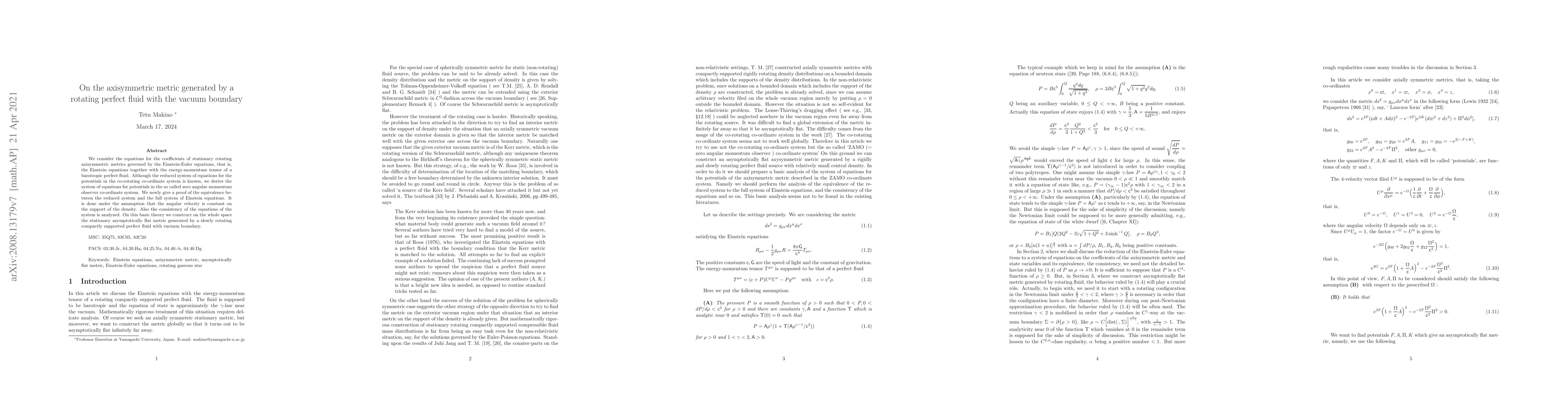 This paper derives the equations governing stationary rotating axisymmetric metrics in a vacuum, considering a perfect fluid described by the Einstein-Euler equations. It establishes the equivalence between reduced and full systems under the assumption of constant angular velocity and constructs a stationary asymptotically flat metric for a slowly rotating perfect fluid.