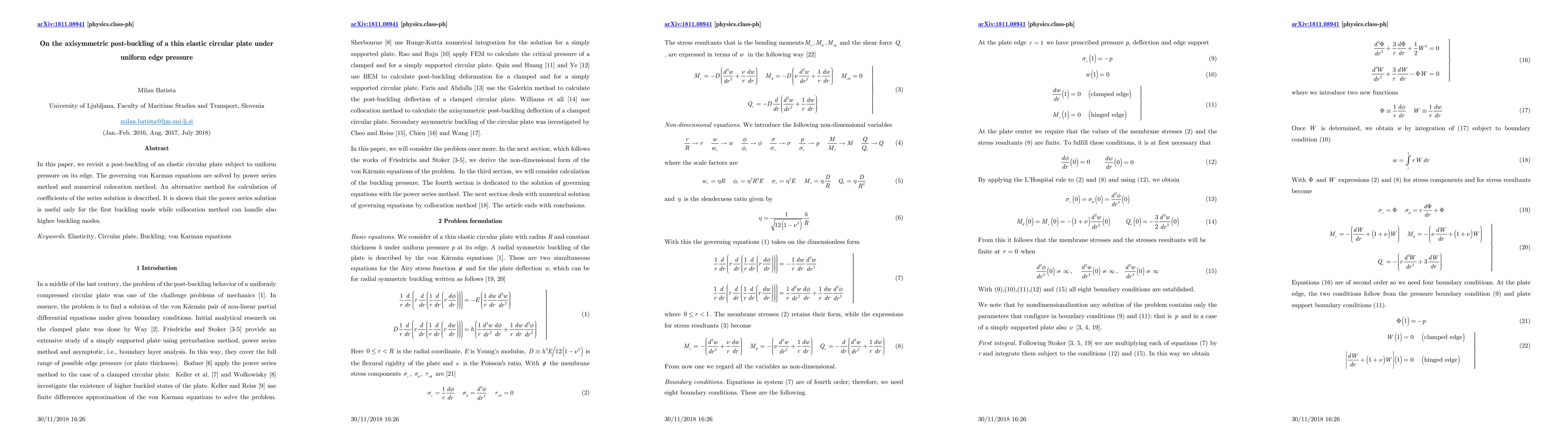 This paper investigates the post-buckling behavior of a thin elastic circular plate under uniform edge pressure, solving the von Karman equations using power series and numerical colocation methods. The power series method is effective only for the first buckling mode, while the colocation method can address higher modes.