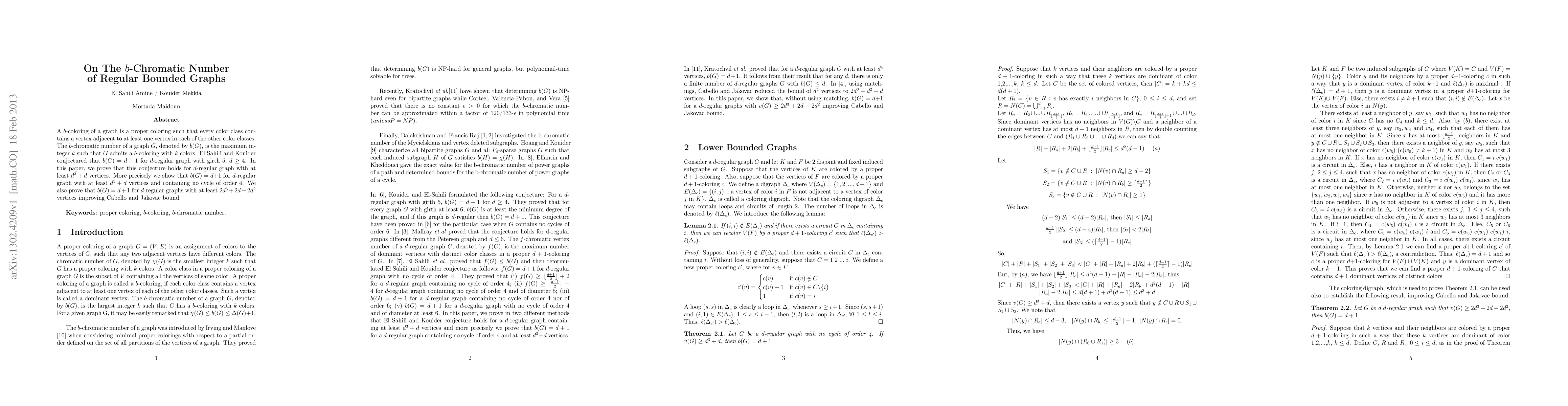 A $b$-coloring of a graph is a proper coloring such that every color class contains a vertex adjacent to at least one vertex in each of the other color classes. The $b$-chromatic number of a graph $G$, denoted by $b(G)$, is the maximum integer $k$ such that $G$ admits a $b$-coloring with $k$ colors. El Sahili and Kouider conjectured that $b(G)=d+1$ for $d$-regular graph with girth 5, $d\geq4$. In this paper, we prove that this conjecture holds for $d$-regular graph with at least $d^3+d$ vertices. More precisely we show that $b(G)=d+$1 for $d$-regular graph with at least $d^3+d$ vertices and containing no cycle of order 4. We also prove that $b(G)=d+1$ for $d$-regular graphs with at least $2d^3+2d-2d^2$ vertices improving Cabello and Jakovac bound.