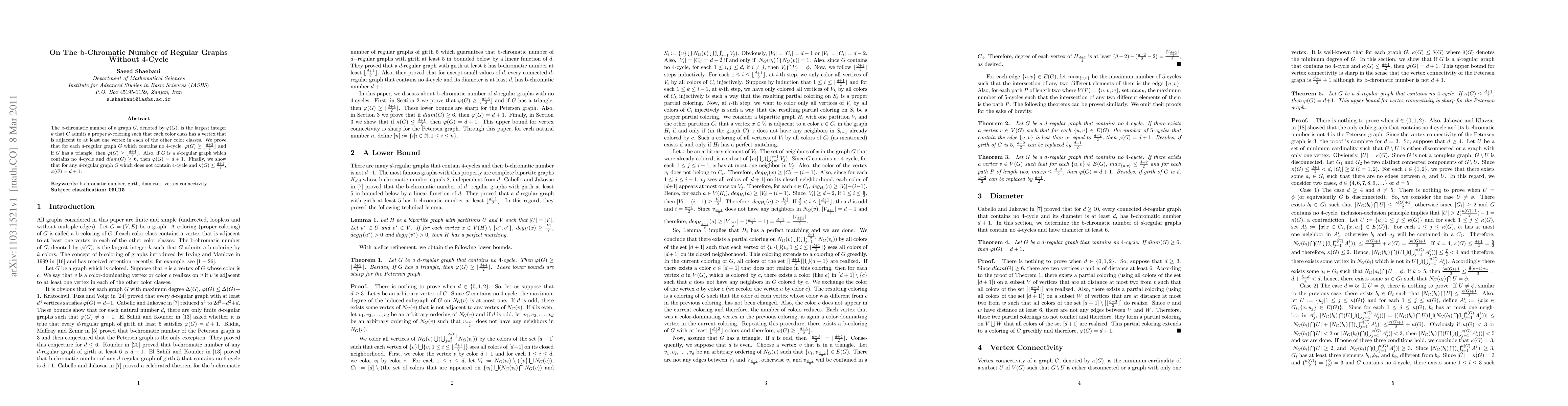 The b-chromatic number of a graph $G$, denoted by $\phi(G)$, is the largest integer $k$ that $G$ admits a proper $k$-coloring such that each color class has a vertex that is adjacent to at least one vertex in each of the other color classes. We prove that for each $d$-regular graph $G$ which contains no 4-cycle, $\phi(G)\geq\lfloor\frac{d+3}{2}\rfloor$ and if $G$ has a triangle, then $\phi(G)\geq\lfloor\frac{d+4}{2}\rfloor$. Also, if $G$ is a $d$-regular graph which contains no 4-cycle and $diam(G)\geq6$, then $\phi(G)=d+1$. Finally, we show that for any $d$-regular graph $G$ which does not contain 4-cycle and $\kappa(G)\leq\frac{d+1}{2}$, $\phi(G)=d+1$.