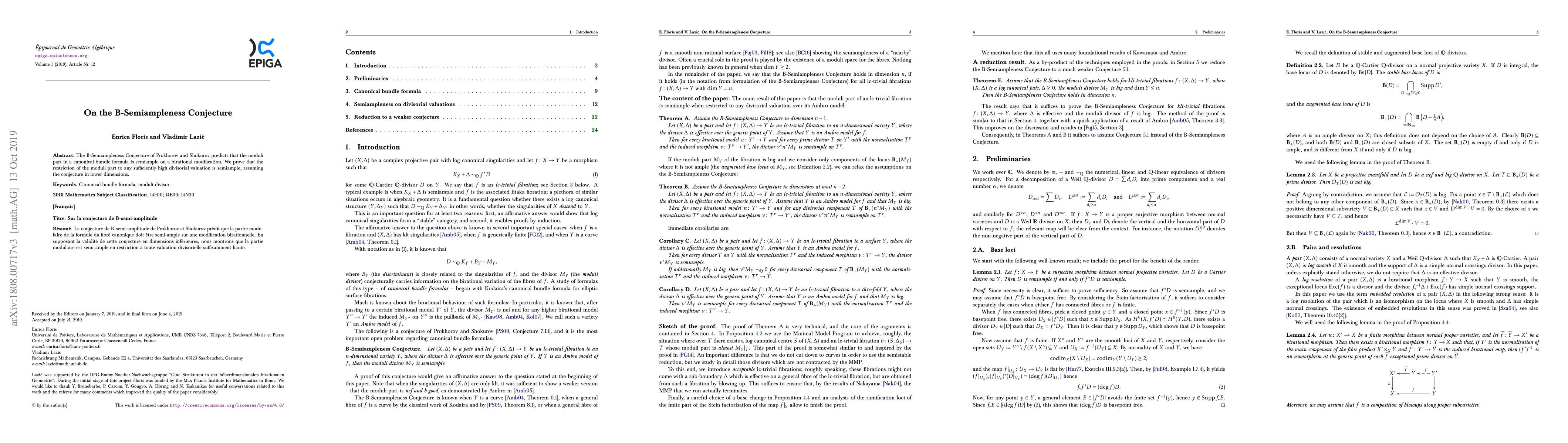 The B-Semiampleness Conjecture posits that the moduli part in a canonical bundle formula is semiample on a birational modification. The paper proves that the moduli part is semiample for sufficiently high divisorial valuations, assuming the conjecture holds in lower dimensions.