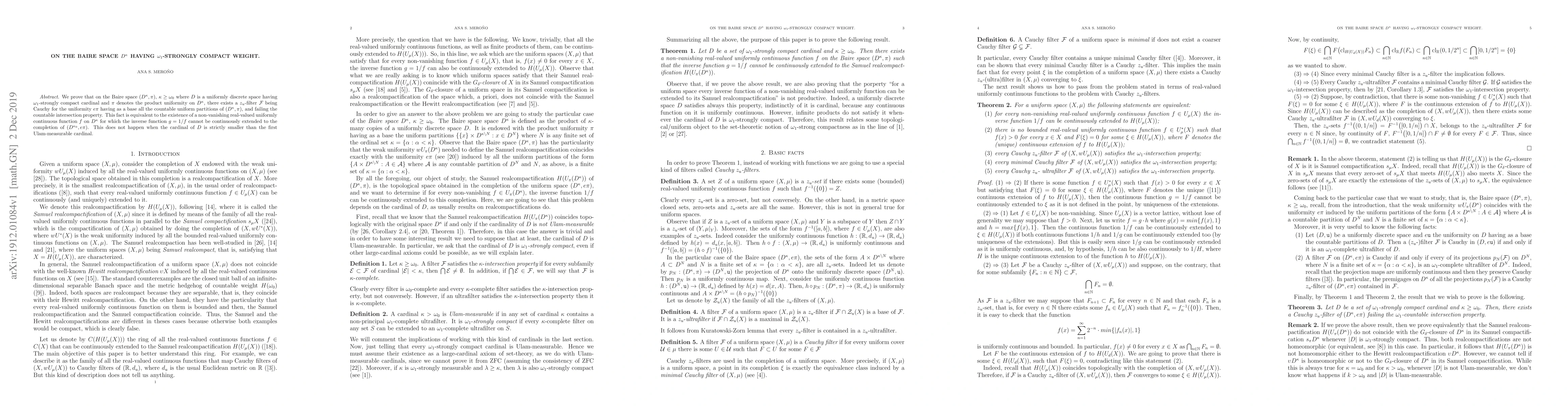 We prove that on the Baire space $(D^{\kappa},\pi)$, $\kappa \geq \omega_0$ where $D$ is a uniformly discrete space having $\omega _1$-strongly compact cardinal and $\pi$ denotes the product uniformity on $D^\kappa$, there exists a $z_u$-filter $\mathcal{F}$ being Cauchy for the uniformity $e\pi$ having as a base all the countable uniform partitions of $(D^\kappa,\pi)$, and failing the countable intersection property. This fact is equivalent to the existence of a non-vanishing real-valued uniformly continuous function $f$ on $D^{\kappa}$ for which the inverse function $g=1/f$ cannot be continuously extended to the completion of $(D^{\kappa _0},e\pi)$. This does not happen when the cardinal of $D$ is strictly smaller than the first Ulam-measurable cardinal.