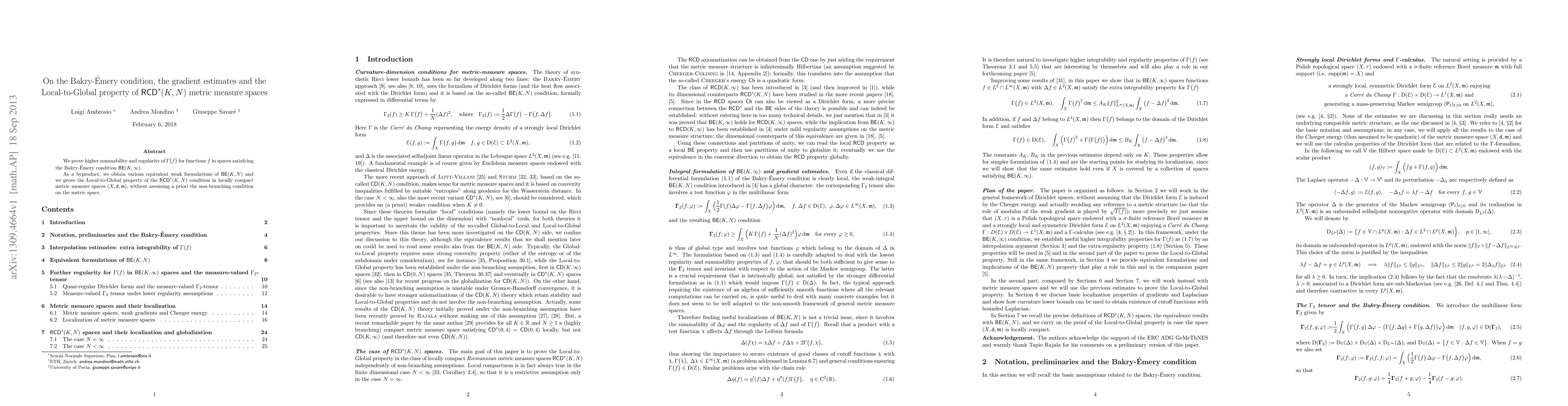 This paper proves higher summability and regularity for the Γ(f) operator in spaces satisfying the Bakry-Emery condition BE(K,∞). It also establishes various equivalent weak formulations of BE(K,N) and demonstrates the Local-to-Global property of RCD*(K,N) spaces without requiring the non-branching condition.