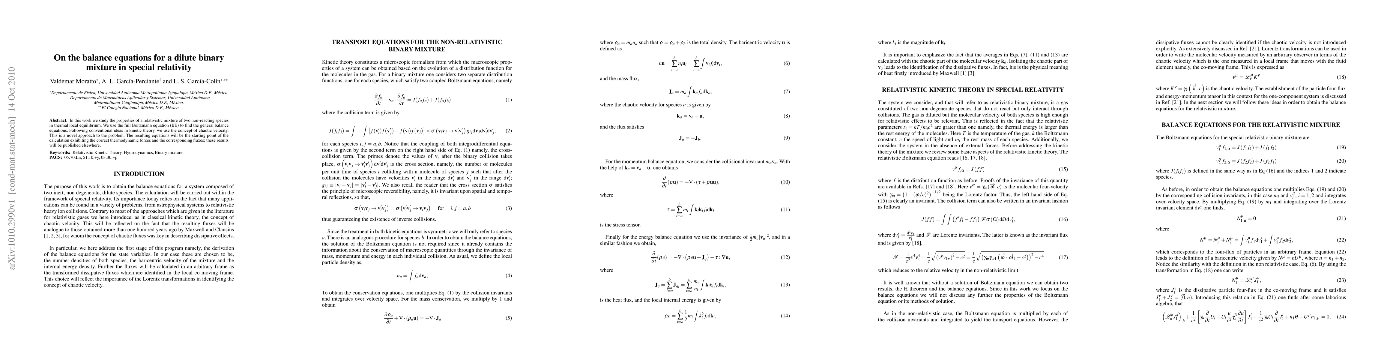 In this work we study the properties of a relativistic mixture of two non-reacting species in thermal local equilibrium. We use the full Boltzmann equation (BE) to find the general balance equations. Following conventional ideas in kinetic theory, we use the concept of chaotic velocity. This is a novel approach to the problem. The resulting equations will be the starting point of the calculation exhibiting the correct thermodynamic forces and the corresponding fluxes; these results will be published elsewhere.