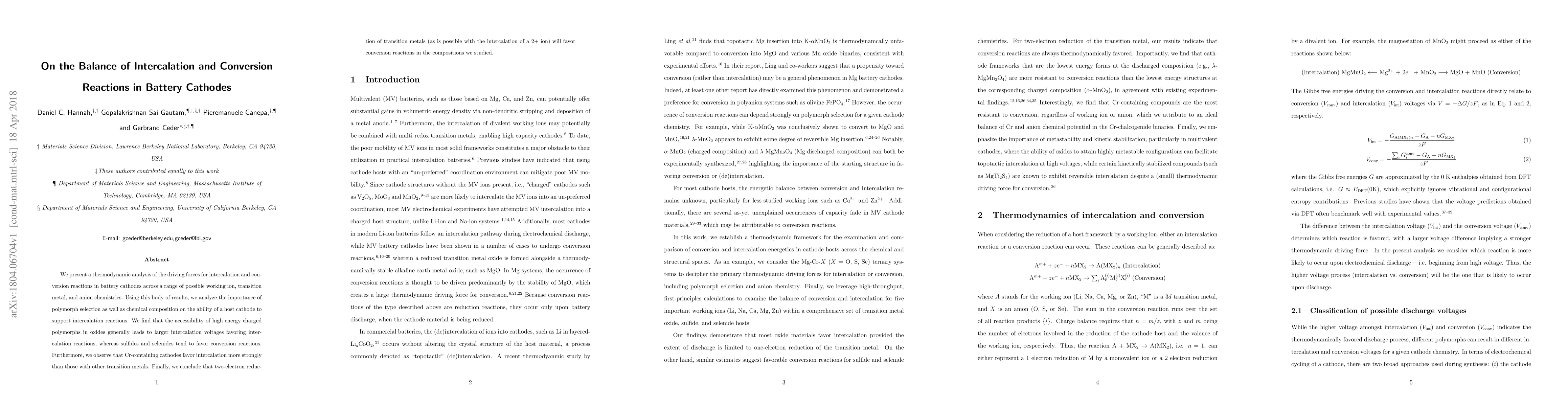 This paper conducts a thermodynamic analysis to compare intercalation and conversion reactions in battery cathodes, finding that oxides favor intercalation while sulfides and selenides favor conversion, with Cr-containing cathodes favoring intercalation more strongly than others.