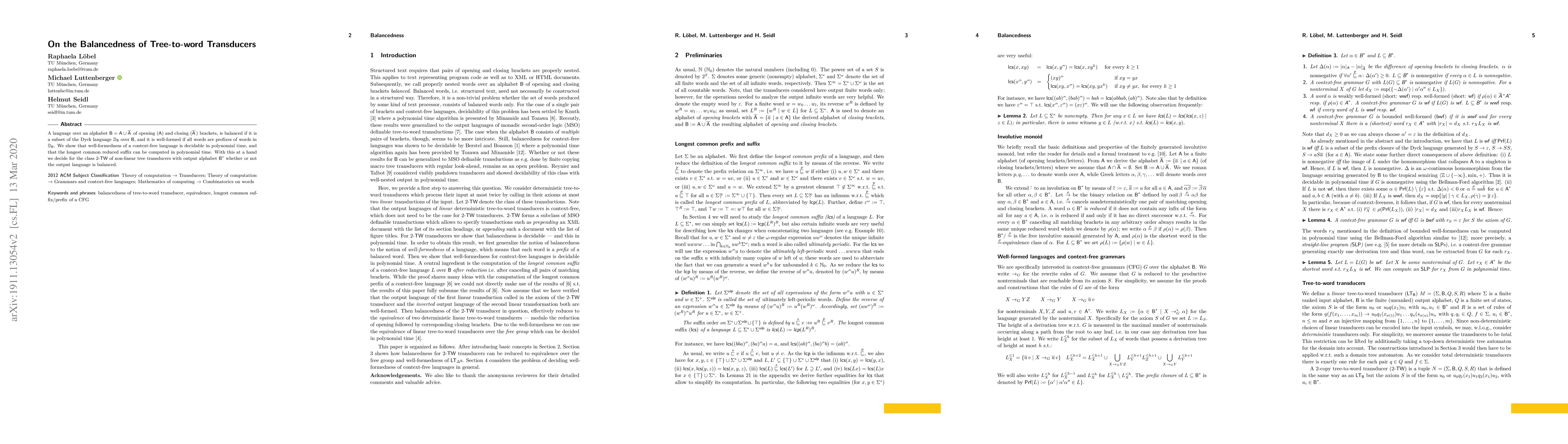 A language over an alphabet $B = A \cup \overline{A}$ of opening ($A$) and closing ($\overline{A}$) brackets, is balanced if it is a subset of the Dyck language $D_B$ over $B$, and it is well-formed if all words are prefixes of words in $D_B$. We show that well-formedness of a context-free language is decidable in polynomial time, and that the longest common reduced suffix can be computed in polynomial time. With this at a hand we decide for the class 2-TWs of non-linear tree transducers with output alphabet $B^*$ whether or not the output language is balanced.