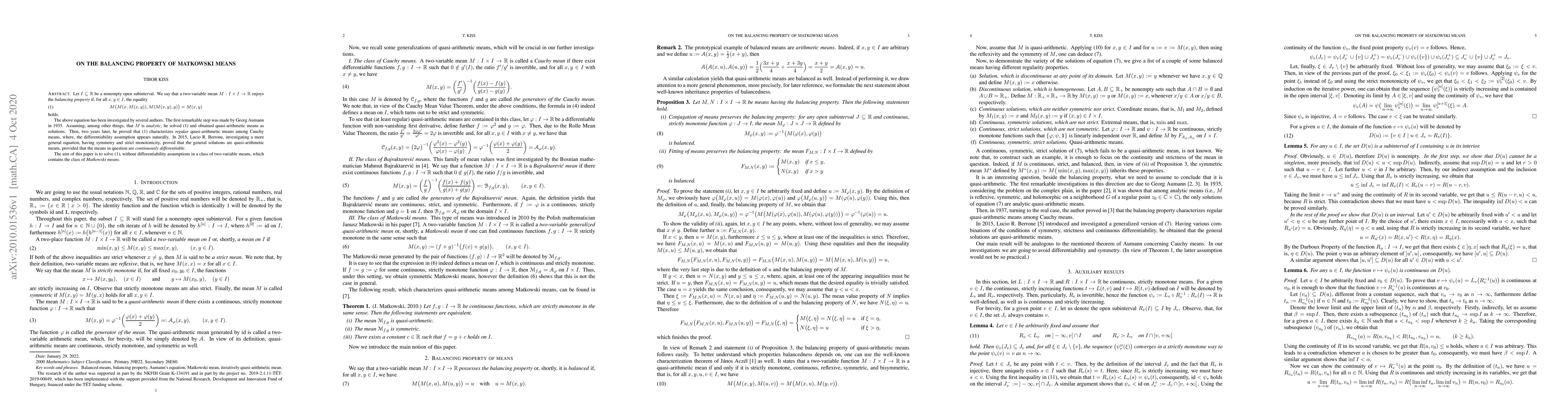 Let $I\subseteq\mathbb{R}$ be a nonempty open subinterval. We say that a two-variable mean $M:I\times I\to\mathbb{R}$ enjoys the \emph{balancing property} if, for all $x,y\in I$, the equality \begin{equation}\tag{1} M\big(M(x,M(x,y)),M(M(x,y),y)\big)=M(x,y) \end{equation} holds. The above equation has been investigated by several authors. The first remarkable step was made by Georg Aumann in 1935. Assuming, among other things, that $M$ is \emph{analytic}, he solved (1) and obtained quasi-arithmetic means as solutions. Then, two years later, he proved that (1) characterizes \emph{regular} quasi-arithmetic means among Cauchy means, where, the differentiability assumption appears naturally. In 2015, Lucio R. Berrone, investigating a more general equation, having symmetry and strict monotonicity, proved that the general solutions are quasi-arithmetic means, provided that the means in question are \emph{continuously differentiable}. The aim of this paper is to solve (1), without differentiability assumptions in a class of two-variable means, which contains the class of \emph{Matkowski means}.