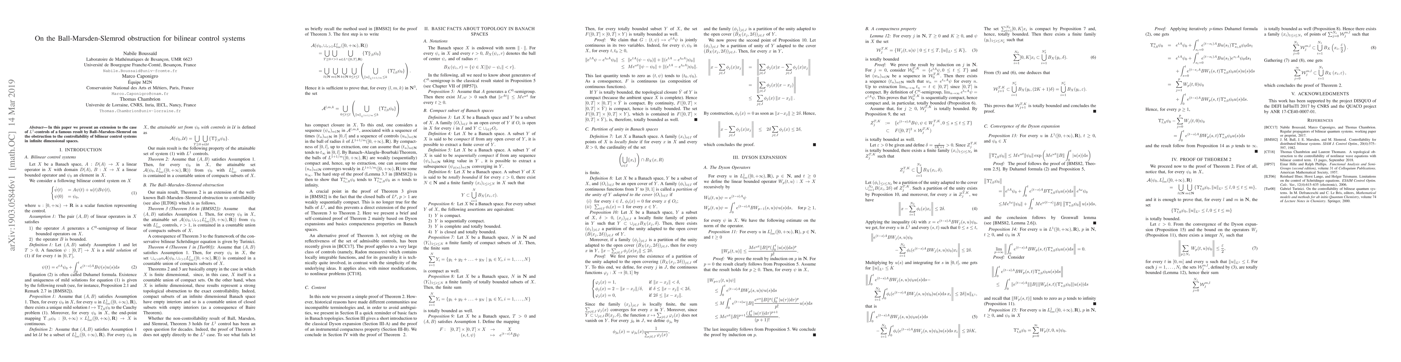 In this paper we present an extension to the case of $L^1$-controls of a famous result by Ball--Marsden--Slemrod on the obstruction to the controllability of bilinear control systems in infinite dimensional spaces.