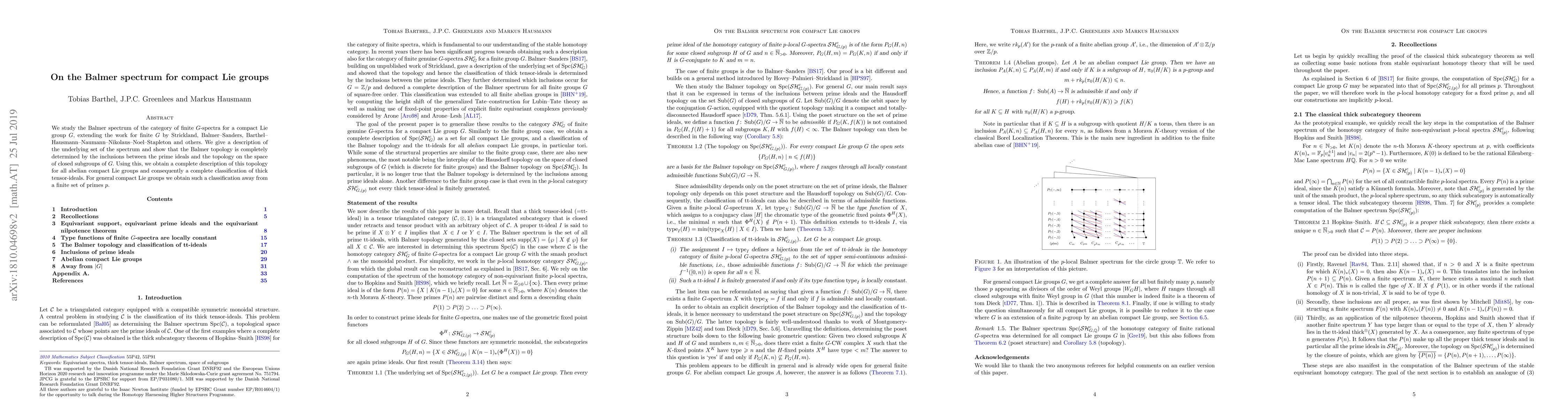 This paper extends previous research on the Balmer spectrum for finite groups to compact Lie groups, describing the underlying set and determining the Balmer topology through subgroup inclusions. It provides a complete classification of thick tensor-ideals for abelian compact Lie groups and a classification for general groups, except for a finite set of primes.