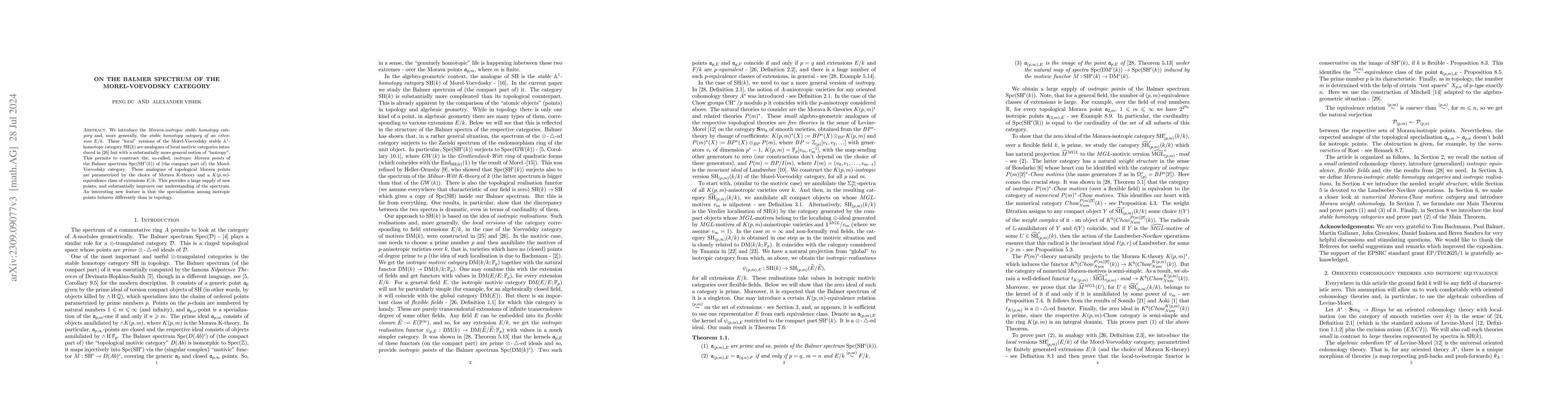 We introduce the Morava-isotropic stable homotopy category and, more generally, the stable homotopy category of an extension $E/k$. These "local" versions of the Morel-Voevodsky stable ${\Bbb{A}}^1$-homotopy category $SH(k)$ are analogues of local motivic categories introduced in [22], but with a substantially more general notion of "isotropy". This permits to construct the, so-called, isotropic Morava points of the Balmer spectrum $\operatorname{Spc}(SH^c(k))$ of (the compact part of) the Morel-Voevodsky category. These analogues of topological Morava points are parametrized by the choice of Morava K-theory and a $K(p,m)$-equivalence class of extensions $E/k$. This provides a large supply of new points, and substantially improves our understanding of the spectrum. An interesting new feature is that the specialization among isotropic points behaves differently than in topology.