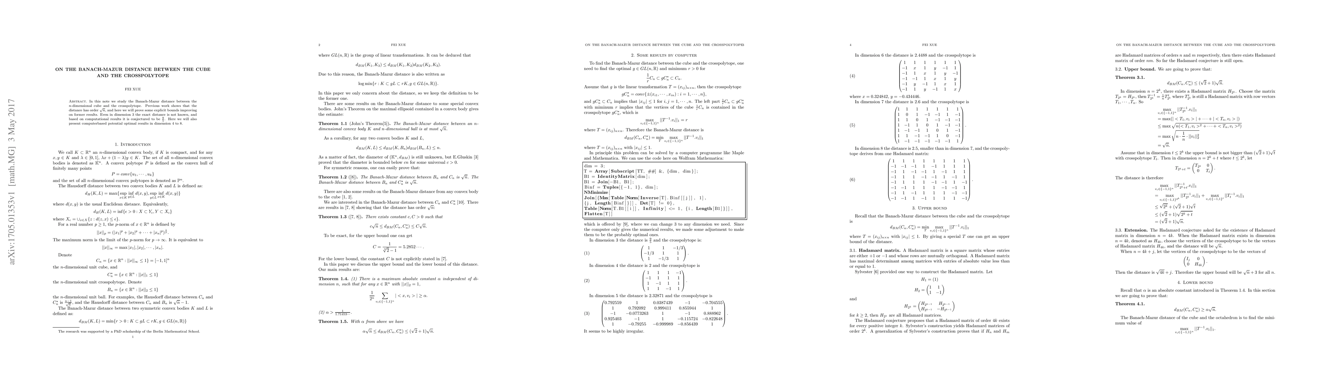 This paper studies the Banach-Mazur distance between the n-dimensional cube and crosspolytope, improving on previous bounds with explicit results for dimensions 3-8.