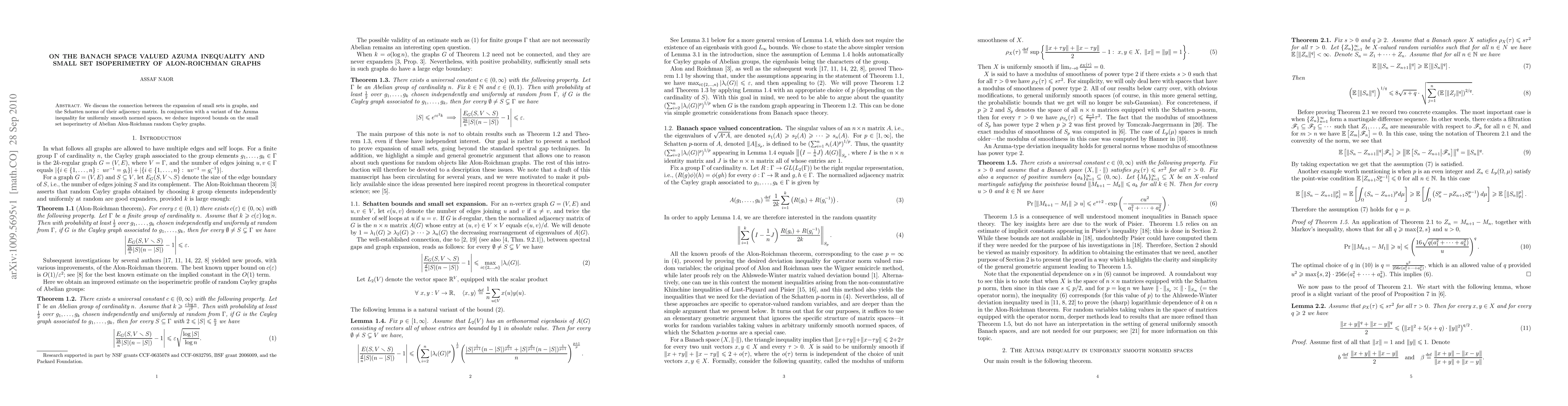 We discuss the connection between the expansion of small sets in graphs, and the Schatten norms of their adjacency matrix. In conjunction with a variant of the Azuma inequality for uniformly smooth normed spaces, we deduce improved bounds on the small set isoperimetry of Abelian Alon-Roichman random Cayley graphs.