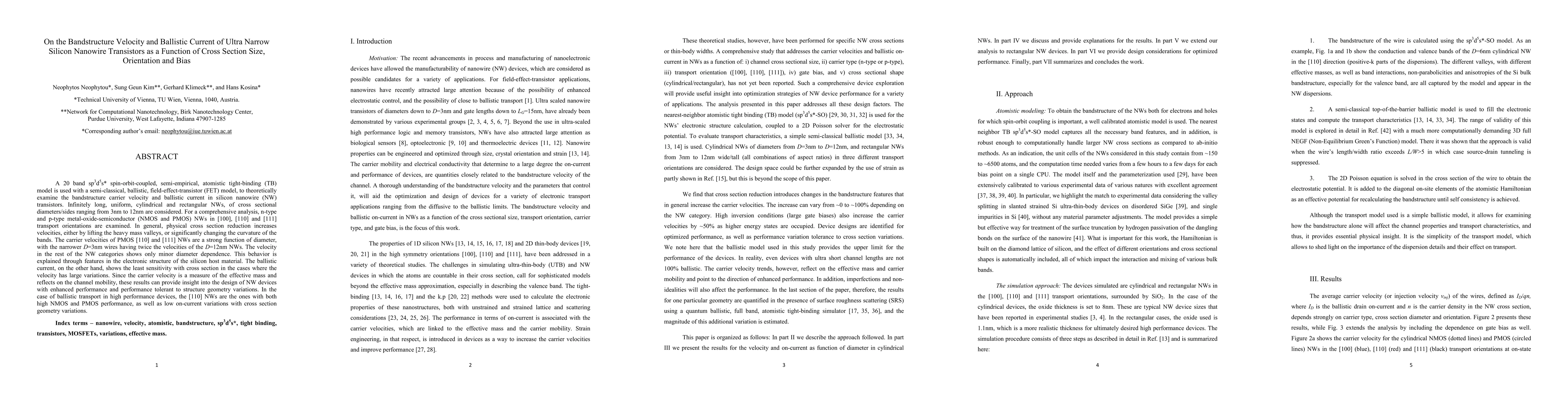 This paper uses a semi-empirical tight-binding model to analyze how carrier velocity and ballistic current in silicon nanowire transistors vary with cross-sectional size, orientation, and bias. It finds that reducing the cross-sectional dimensions enhances carrier velocities, particularly in PMOS [110] and [111] orientations, while ballistic current shows minimal sensitivity to cross-section size.