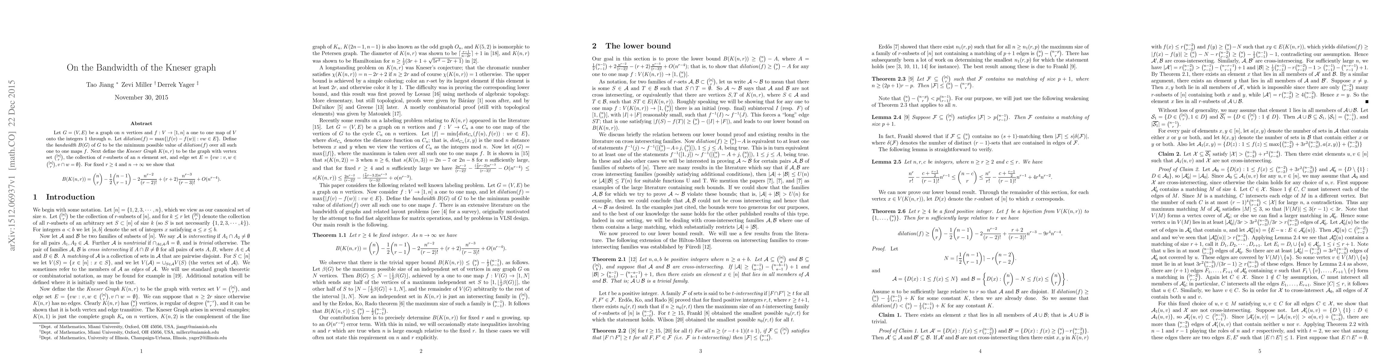 The bandwidth of the Kneser Graph is found to decrease as n approaches infinity for fixed r >= 4, with a specific formula provided.