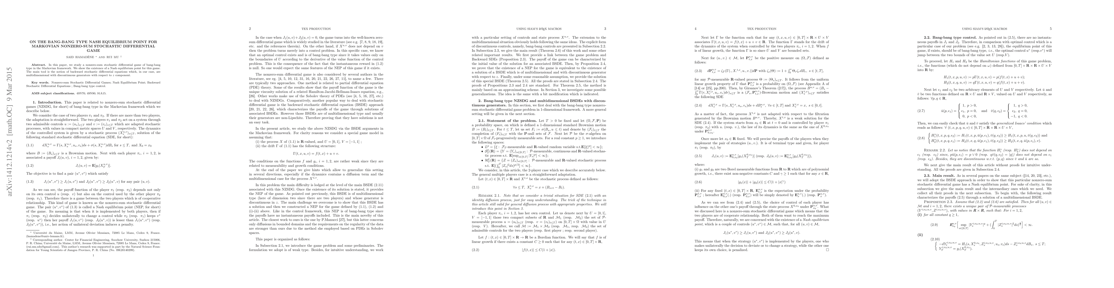 This paper investigates a Markovian nonzero-sum stochastic differential game, proving the existence of a discontinuous, bang-bang type Nash equilibrium under certain conditions. The study employs backward stochastic differential equations with multidimensional, discontinuous generators.