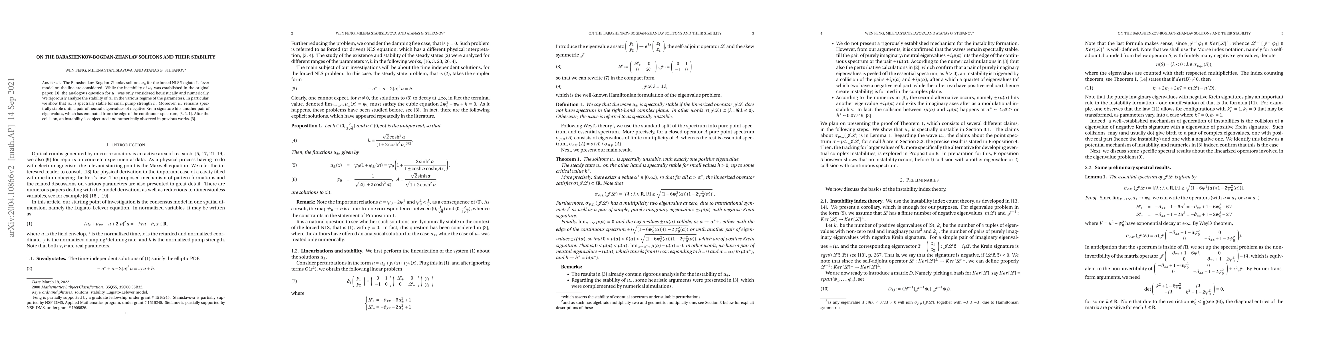 The Barashenkov-Bogdan-Zhanlav solitons $u_\pm$ for the forced NLS/Lugiato-Lefever model on the line are considered. While the instability of $u_+$ was established in the original paper, \cite{B1}, the analogous question for $u_-$ was only considered heuristically and numerically. We rigorously analyze the stability of $u_-$ in the various regime of the parameters. In particular, we show that $u_-$ is spectrally stable for small pump strength $h$. Moreover, $u_-$ remains spectrally stable until a pair of neutral eigenvalues of negative Krein signature hits another pair of eigenvalues, which has emanated from the edge of the continuous spectrum, \cite{B1, BBK, ABP}. After the collision, an instability is conjectured and numerically observed in previous works, \cite{B1}.