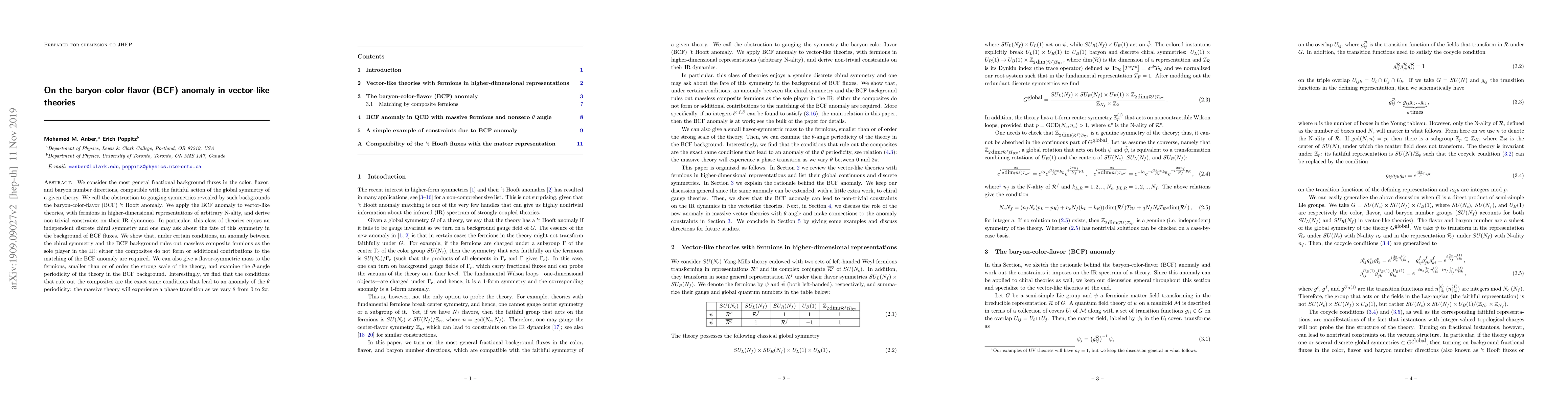We consider the most general fractional background fluxes in the color, flavor, and baryon number directions, compatible with the faithful action of the global symmetry of a given theory. We call the obstruction to gauging symmetries revealed by such backgrounds the baryon-color-flavor (BCF) 't Hooft anomaly. We apply the BCF anomaly to vector-like theories, with fermions in higher-dimensional representations of arbitrary N-ality, and derive non-trivial constraints on their IR dynamics. In particular, this class of theories enjoys an independent discrete chiral symmetry and one may ask about the fate of this symmetry in the background of BCF fluxes. We show that, under certain conditions, an anomaly between the chiral symmetry and the BCF background rules out massless composite fermions as the sole player in the IR: either the composites do not form or additional contributions to the matching of the BCF anomaly are required. We can also give a flavor-symmetric mass to the fermions, smaller than or of order the strong scale of the theory, and examine the $\theta$-angle periodicity of the theory in the BCF background. Interestingly, we find that the conditions that rule out the composites are the exact same conditions that lead to an anomaly of the $\theta$ periodicity: the massive theory will experience a phase transition as we vary $\theta$ from $0$ to $2\pi$.