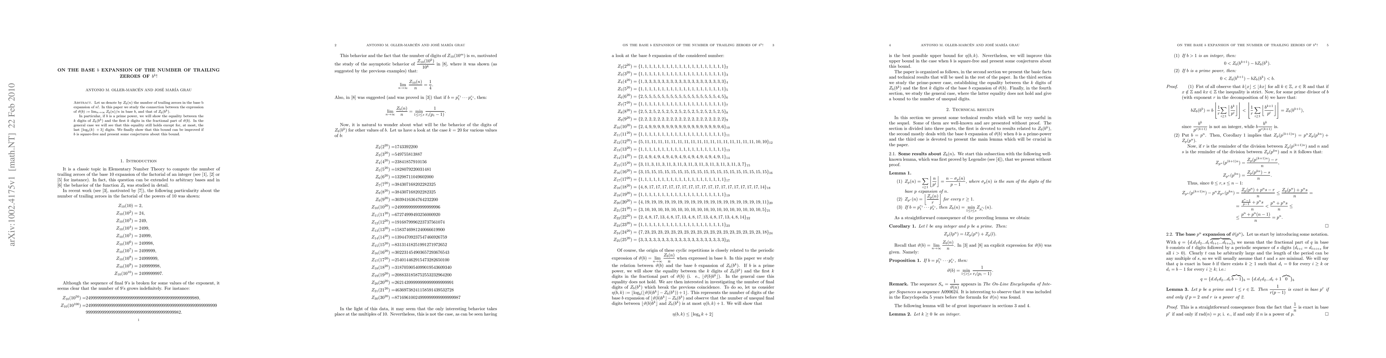Let us denote by $Z_{b}(n)$ the number of trailing zeroes in the base b expansion of $n!$. In this paper we study the connection between the expression of $\vartheta(b):=\lim_{n\to \infty}Z_{b}(n)/n$ in base $b$, and that of $Z_{b}(b^{k})$. In particular, if $b$ is a prime power, we will show the equality between the $k$ digits of $Z_{b}(b^{k})$ and the first $k$ digits in the fractional part of $\vartheta (b)$. In the general case we will see that this equality still holds except for, at most, the last $\lfloor \log_{b}(k) +3\rfloor $ digits. We finally show that this bound can be improved if $b$ is square-free and present some conjectures about this bound.