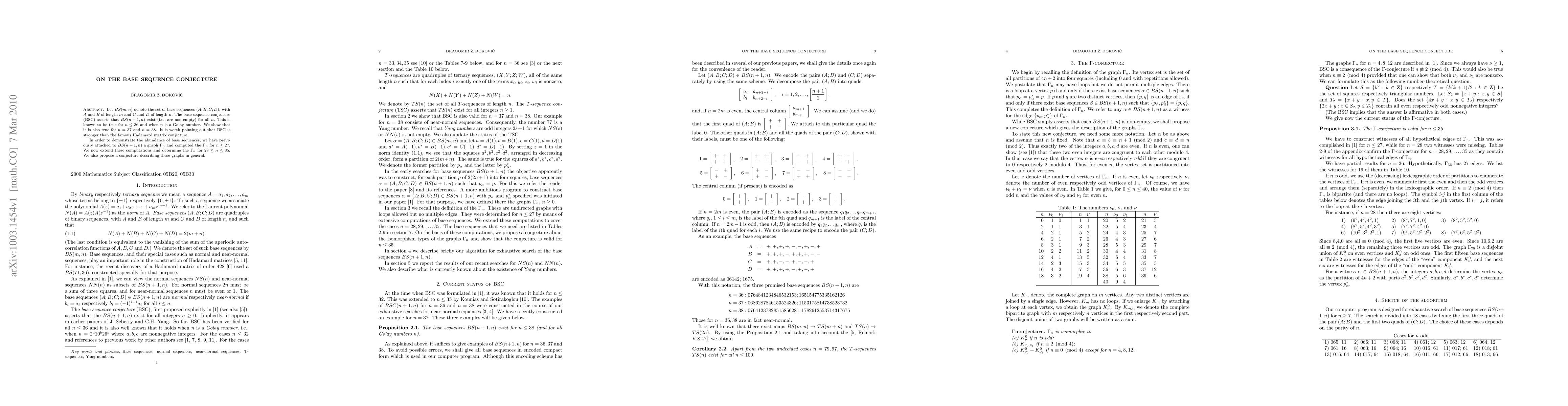 This paper confirms the base sequence conjecture (BSC) for n=37 and n=38, extending known results for n <= 36 and Golay numbers. It also extends the computation of associated graphs Gamma_n for n=28 to n=35, proposing a general conjecture about these graphs.
