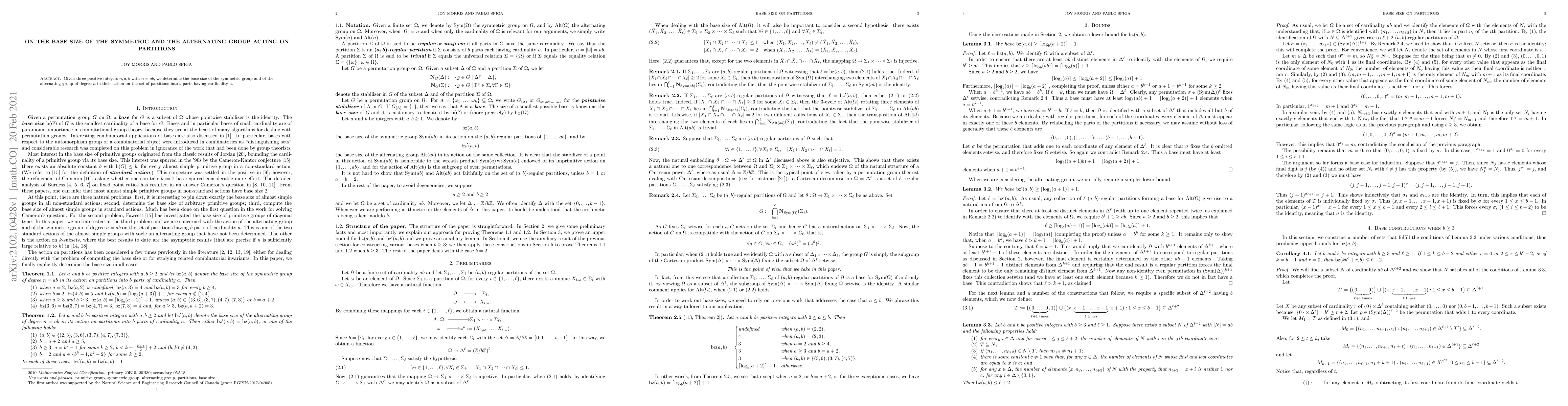 The paper calculates the base size of the symmetric and alternating group acting on partitions of a specific type, relating to the number of positive integers n, a, and b with n=ab. It provides new insights into these groups' actions on partition sets.