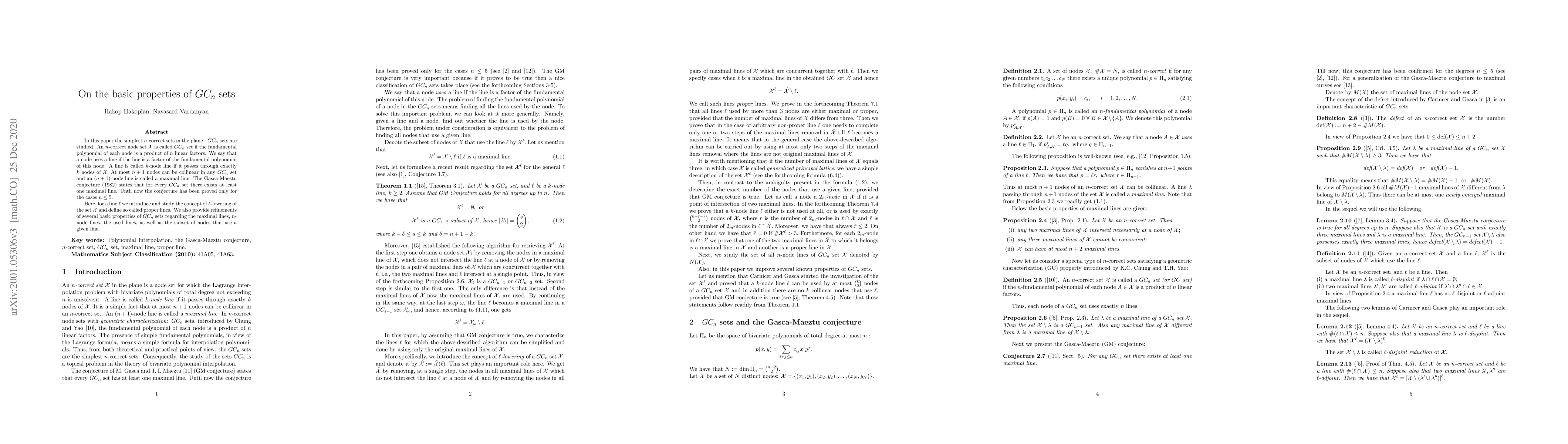 A planar node set $\mathcal X,$ with $\#\mathcal X=\binom{n+2}{2},$ is called $GC_n$ set if each node possesses fundamental polynomial in form of a product of $n$ linear factors. We say that a node uses a line if the line is a factor of the fundamental polynomial of the node. A line is called $k$-node line if it passes through exactly $k$-nodes of $\mathcal X.$ At most $n+1$ nodes can be collinear in any $GC_n$ set and an $(n+1)$-node line is called a maximal line. The Gasca-Maeztu conjecture (1982) states that every $GC_n$ set has a maximal line. Until now the conjecture has been proved only for the cases $n \le 5.$ Here, for a line $\ell$ we introduce and study the concept of $\ell$-lowering of the set $\mathcal X$ and define so called proper lines. We also provide refinements of several basic properties of $GC_n$ sets regarding the maximal lines, $n$-node lines, the used lines, as well as the subset of nodes that use a given line.