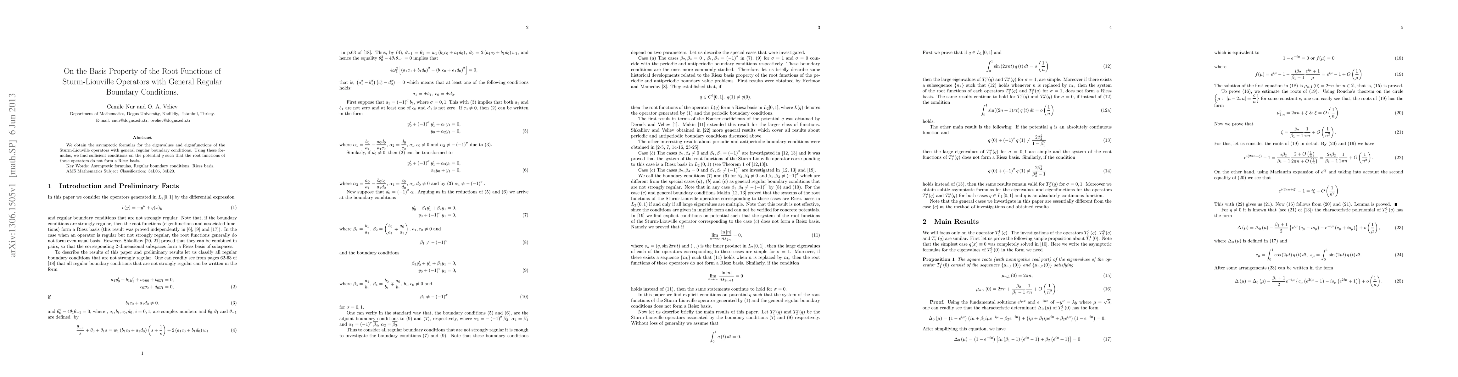 Summary: This paper derives asymptotic formulas for eigenvalues and eigenfunctions of Sturm-Liouville operators with general regular boundary conditions. It establishes sufficient conditions on the potential q to ensure the root functions do not form a Riesz basis.