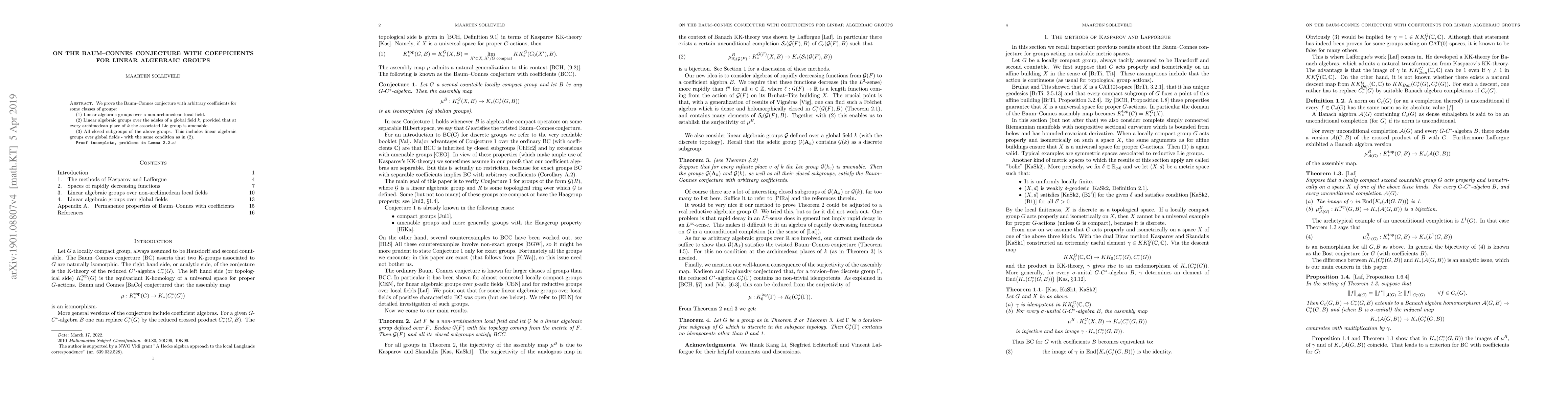 The paper proves the Baum--Connes conjecture with coefficients for certain linear algebraic groups, including those over non-archimedean local fields and global fields under specific conditions, but the main results are incomplete and potentially irreparable.