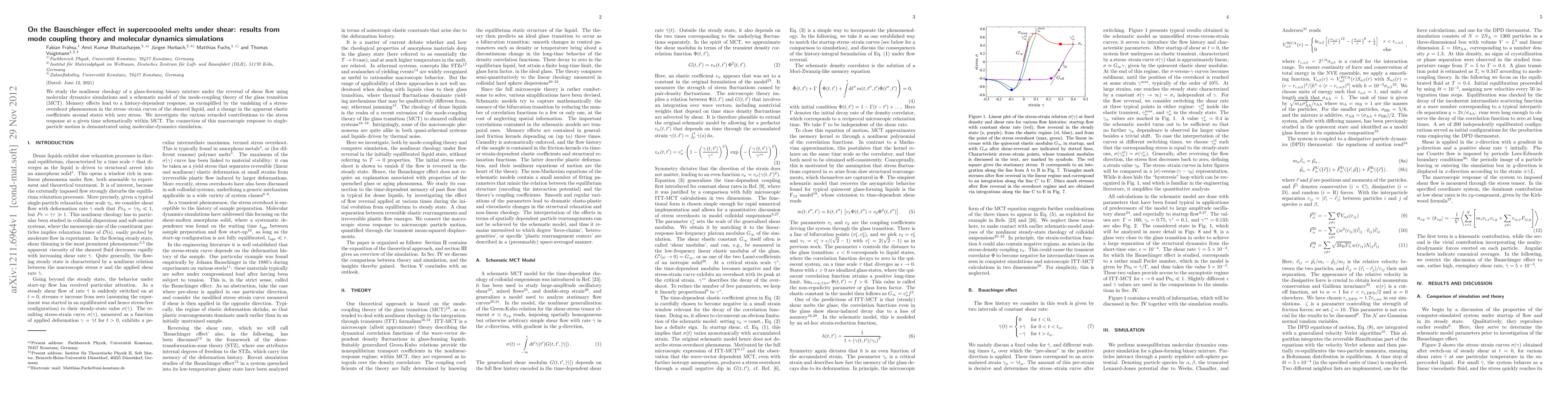 This paper investigates the Bauschinger effect in supercooled glass-forming liquids under shear, combining mode coupling theory and molecular dynamics simulations. It reveals history-dependent rheological responses, including the disappearance of stress overshoot and altered elastic coefficients, linking macroscopic stress responses to single-particle dynamics.