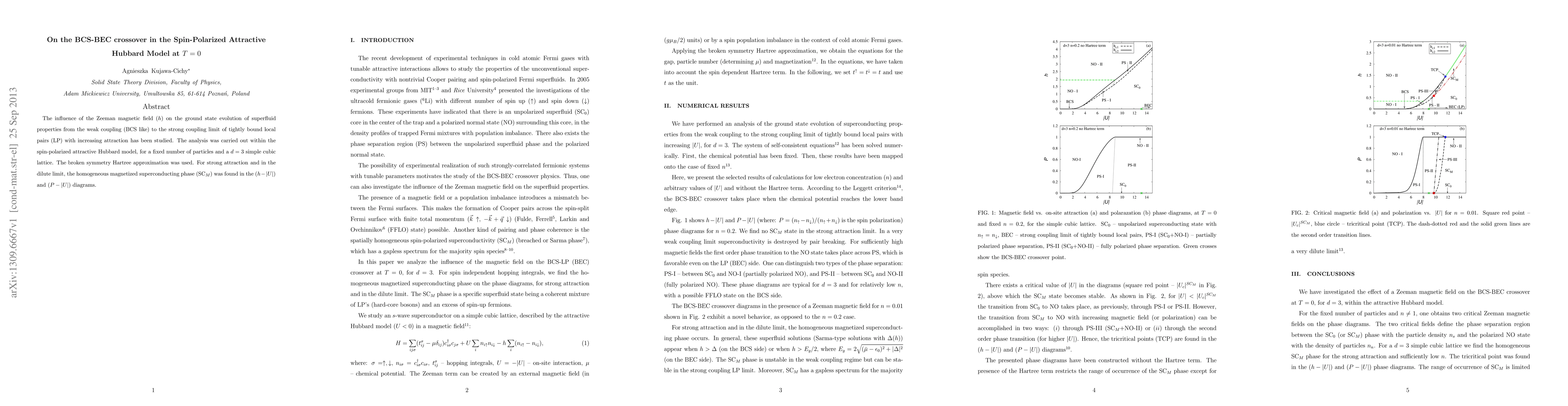 The influence of the Zeeman magnetic field ($h$) on the ground state evolution of superfluid properties from the weak coupling (BCS like) to the strong coupling limit of tightly bound local pairs (LP) with increasing attraction has been studied. The analysis was carried out within the spin-polarized attractive Hubbard model, for a fixed number of particles and a $d=3$ simple cubic lattice. The broken symmetry Hartree approximation was used. For strong attraction and in the dilute limit, the homogeneous magnetized superconducting phase (SC$_M$) was found in the $(h-|U|)$ and ($P-|U|$) diagrams.