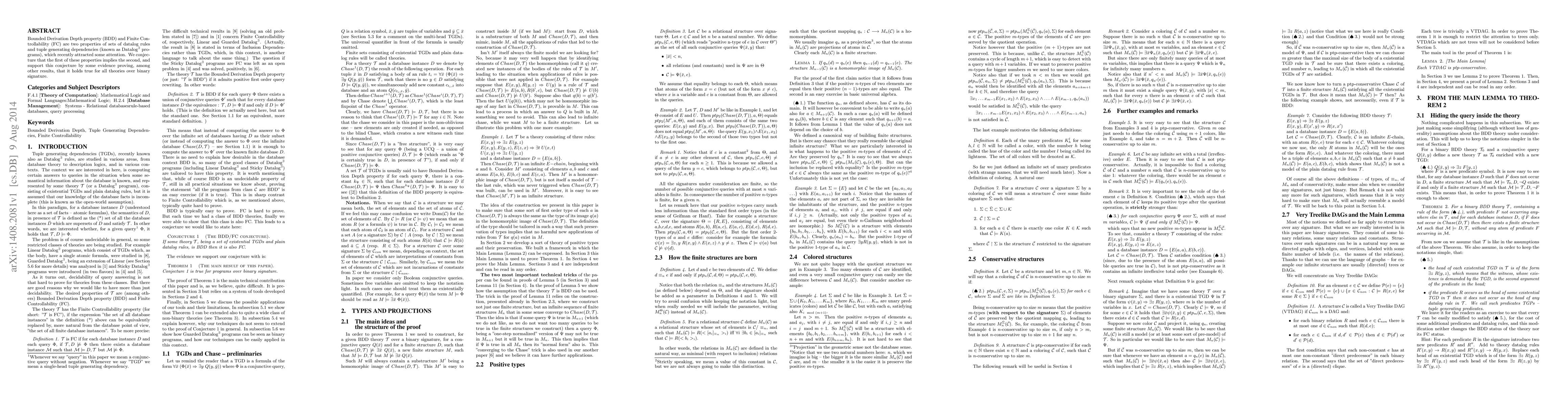 Bounded Derivation Depth property (BDD) and Finite Controllability (FC) are two properties of sets of datalog rules and tuple generating dependencies (known as Datalog +/- programs), which recently attracted some attention. We conjecture that the first of these properties implies the second, and support this conjecture by some evidence proving, among other results, that it holds true for all theories over binary signature.