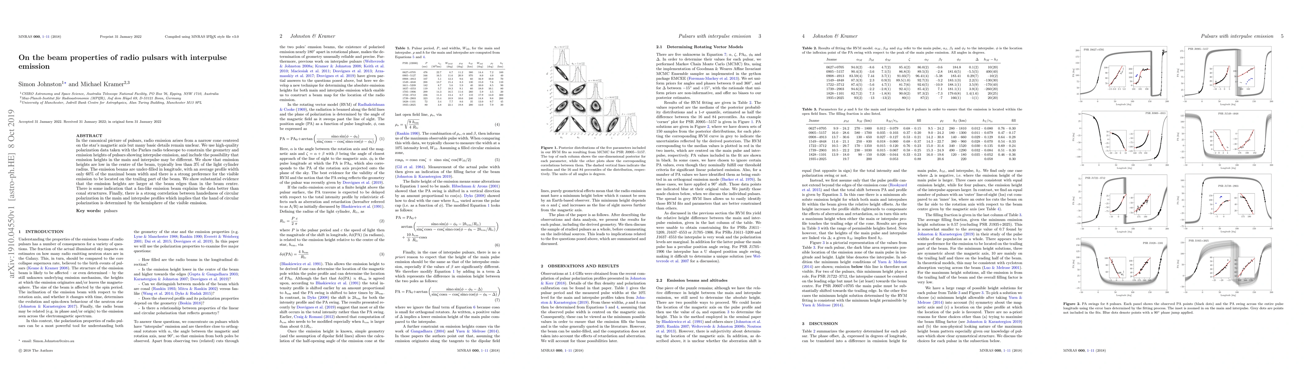 Researchers studied radio pulsars with interpulse emission using high-quality polarization data, finding that emission heights are low in the beam center and larger at edges, and suggesting a fan-like emission beam model for better explanation.