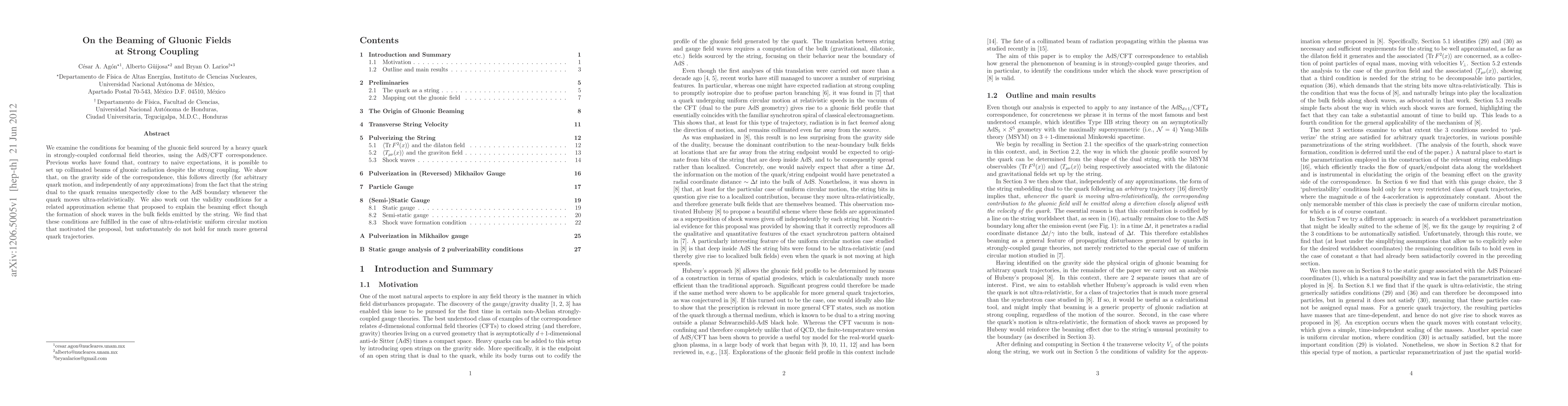 We examine the conditions for beaming of the gluonic field sourced by a heavy quark in strongly-coupled conformal field theories, using the AdS/CFT correspondence. Previous works have found that, contrary to naive expectations, it is possible to set up collimated beams of gluonic radiation despite the strong coupling. We show that, on the gravity side of the correspondence, this follows directly (for arbitrary quark motion, and independently of any approximations) from the fact that the string dual to the quark remains unexpectedly close to the AdS boundary whenever the quark moves ultra-relativistically. We also work out the validity conditions for a related approximation scheme that proposed to explain the beaming effect though the formation of shock waves in the bulk fields emitted by the string. We find that these conditions are fulfilled in the case of ultra-relativistic uniform circular motion that motivated the proposal, but unfortunately do not hold for much more general quark trajectories.